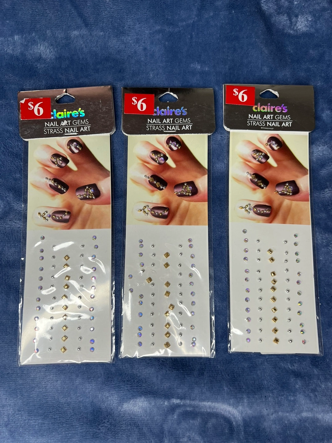 Three packs of nail art gems. Each pack has different shaped and coloured gems. $3 each pack.