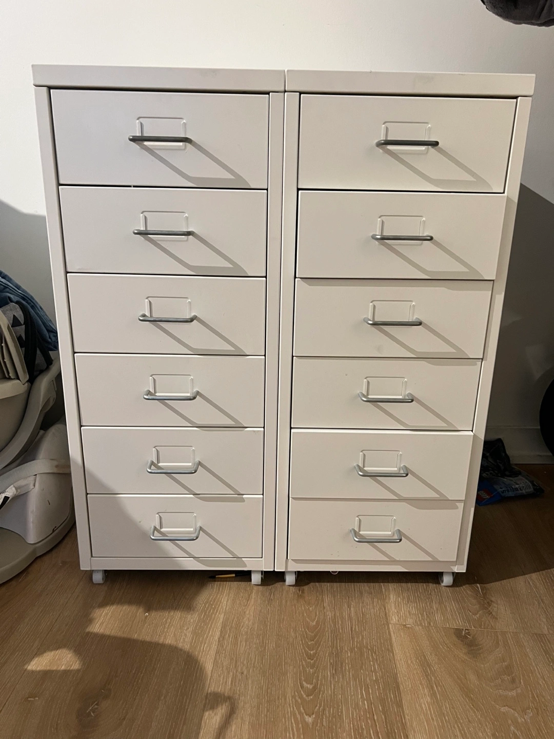 Two white drawer units, Each unit has six drawers. They are in good condition, but they have some minor scuffs on the front of the drawers.