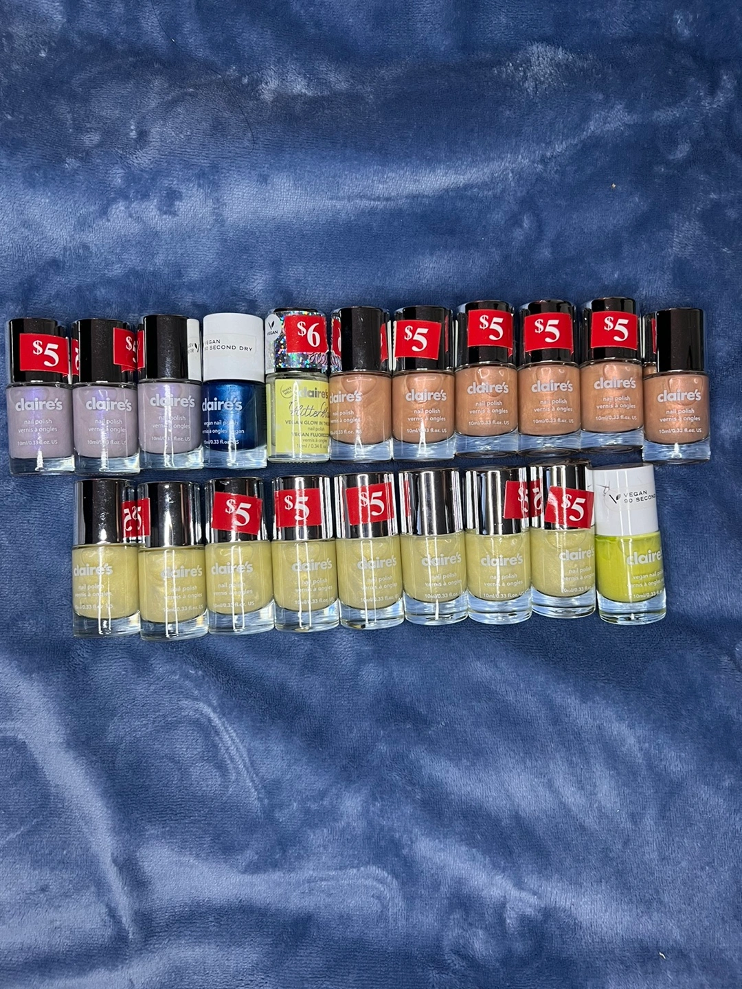 Lot of 16 Claire's nail polish bottles. Includes multiple colours and finishes. $2 each