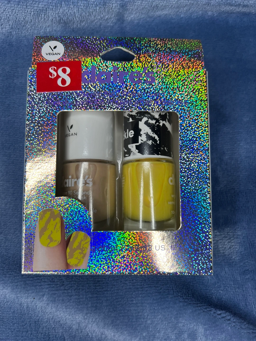 Two nail polish bottles, one is yellow with a black and white design, one is beige. Includes two pairs of fake nails with yellow and brown designs.