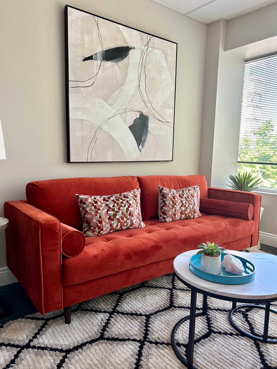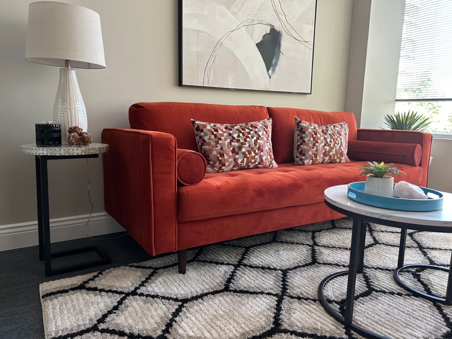 Mid century modern rust velvet 3 seater sofa gently used in Therapist’s office. In excellent condition with no signs of wear. Seat is bench style with 2 back cushions and 2 bolster pillows. Retail $1130. Less than one year old. Accent pillows not included. Available for $95. Per pair.