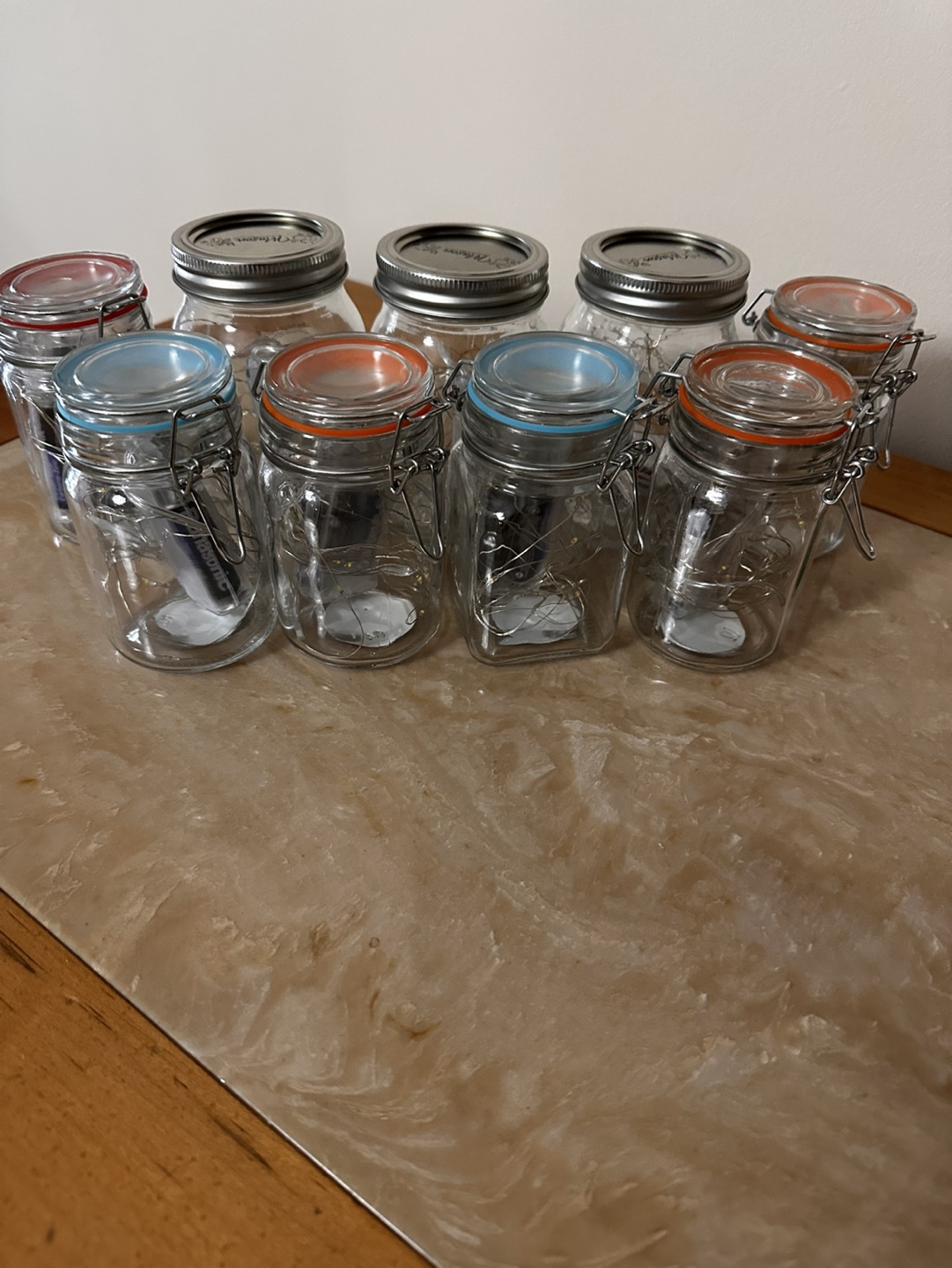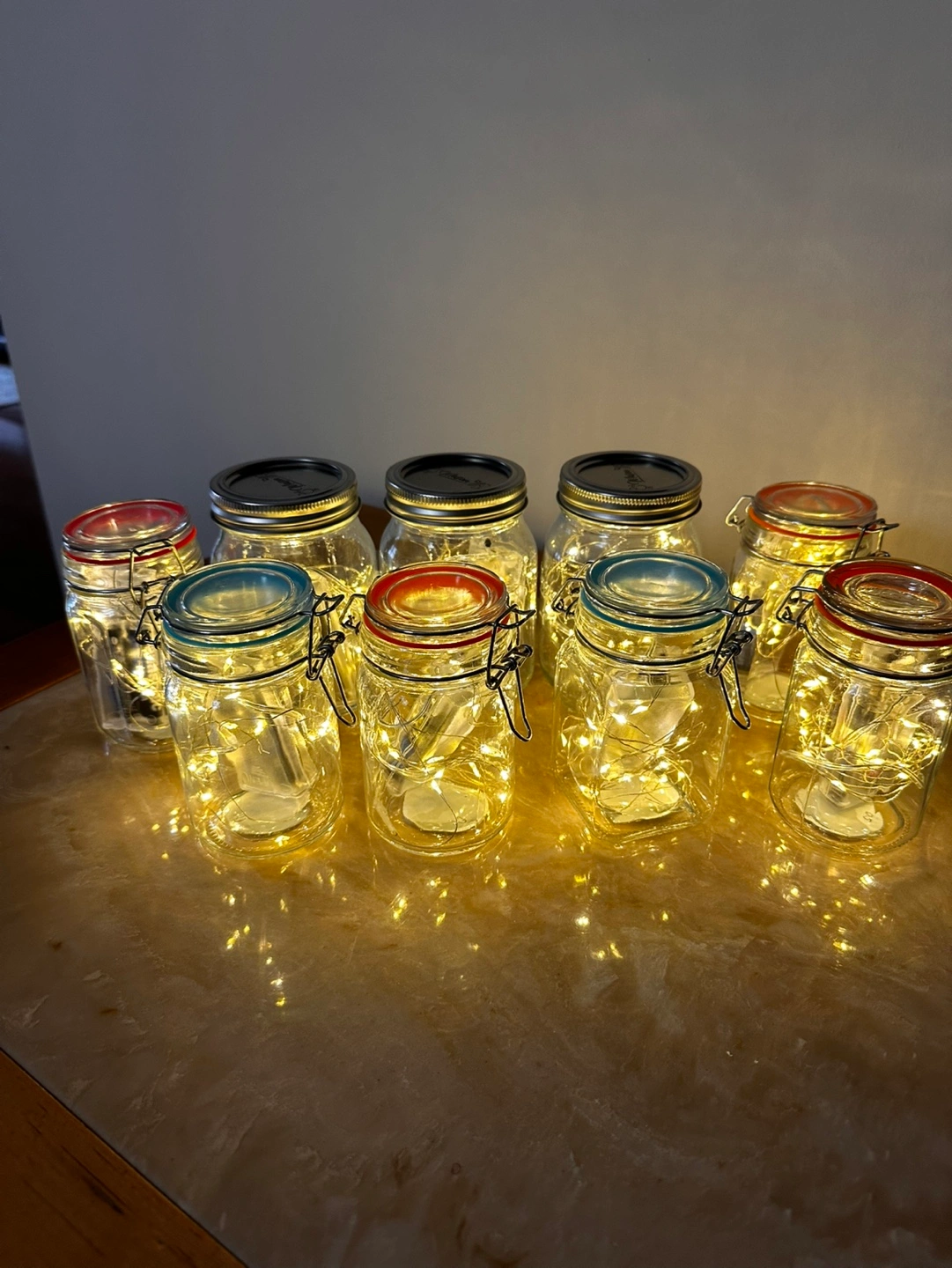 Set of 8 glass jars with fairy lights. Each jar features a metal lid with a blue and orange seal. The jars contain a string of fairy lights, ideal for ambient lighting.