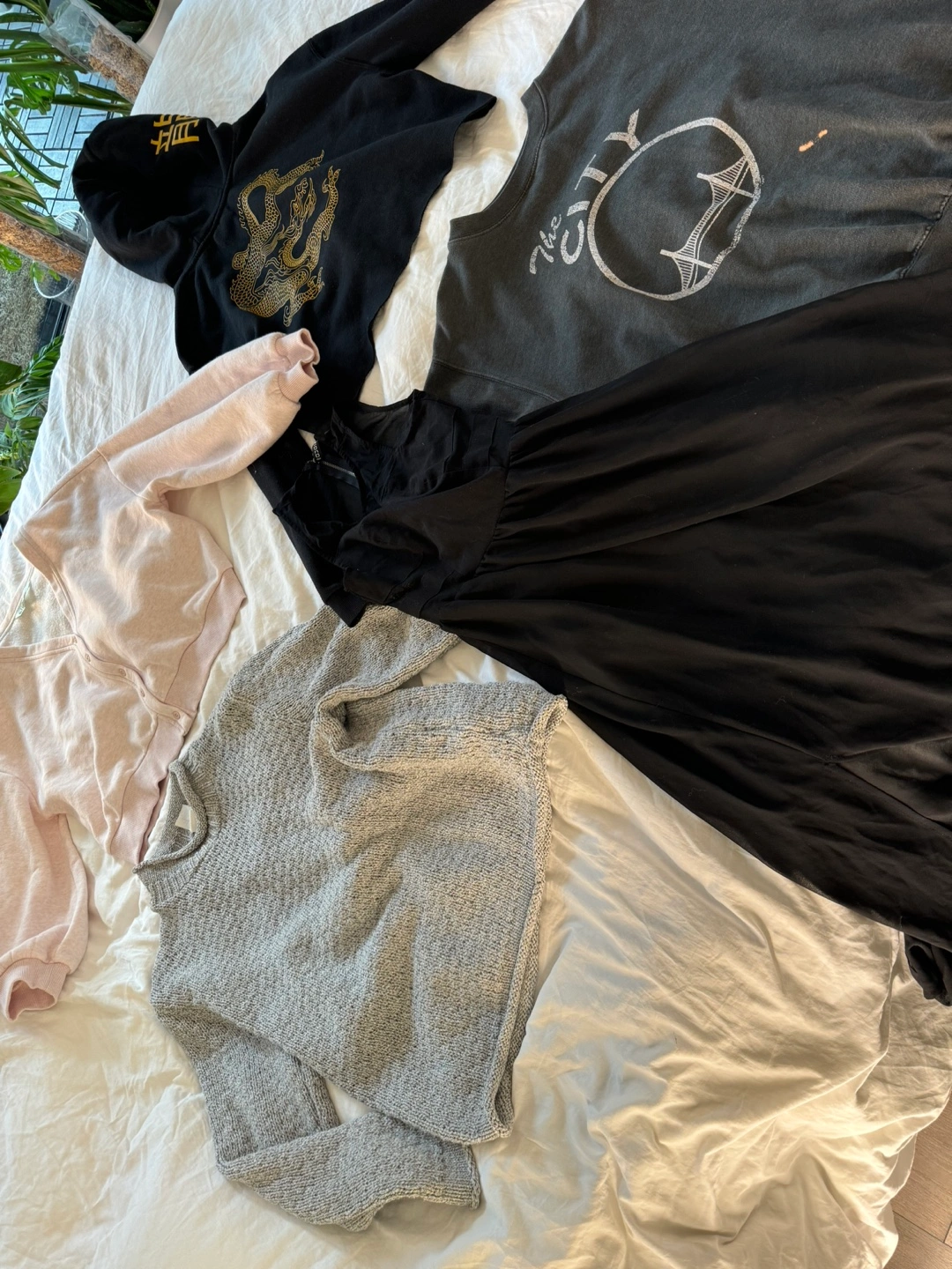 Pick up at Adelaide/Sherborne. Message what you would like and pick up date and time. Book: Through Black Spruce Black Dragon Crop Sweater Black Dress (S) Grey Knit Sweater (S/M) Grey Skirt (S) Pink Sweater (S) The City Sweater (S) Kong Frisbee Rens Pets Frisbee Club House Montreal Meat (Opened) Cocada de Leche Gummy Making Kit Zen Gingers Tea Rebellion (Opened, BB 2023 March) Foaming Hand Sanitizer Kids Tattoos