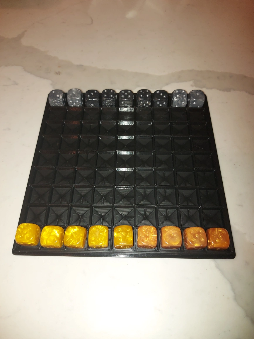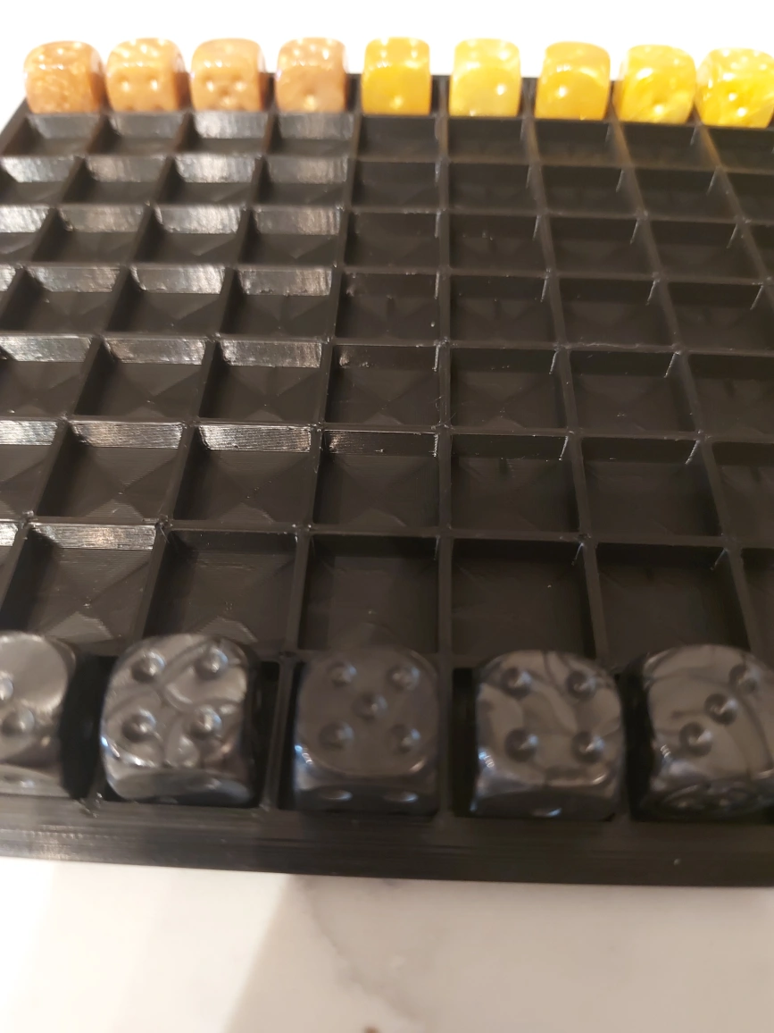 Each player must aim to fill his opponent's base row with all his dice, and with their highest possible numbers facing up. —all involved dice are eliminated. Tilt your die forward or sideways once, and then jump over one or more of either your own or your opponent's dice, vertically.