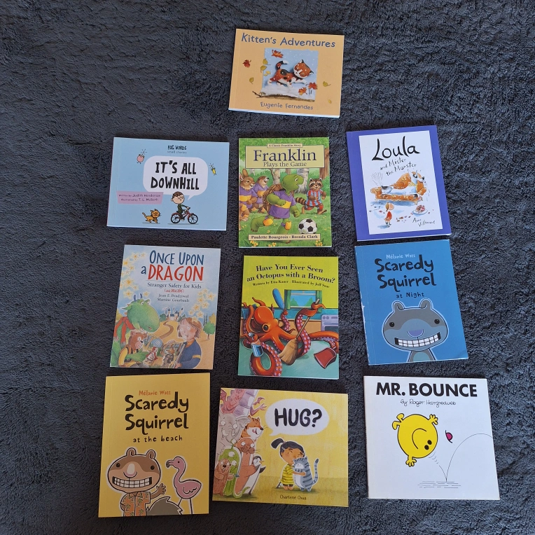 527A set of 9 children's books. Titles include: Kitten's Adventures, It's All Downhill, Franklin Plays the Game, Loula and Mister the Monster, Once Upon a Dragon, Have You Ever Seen an Octopus with a Broom?, Scaredy Squirrel at Night, Scaredy Squirrel at the Beach, and Mr. Bounce.