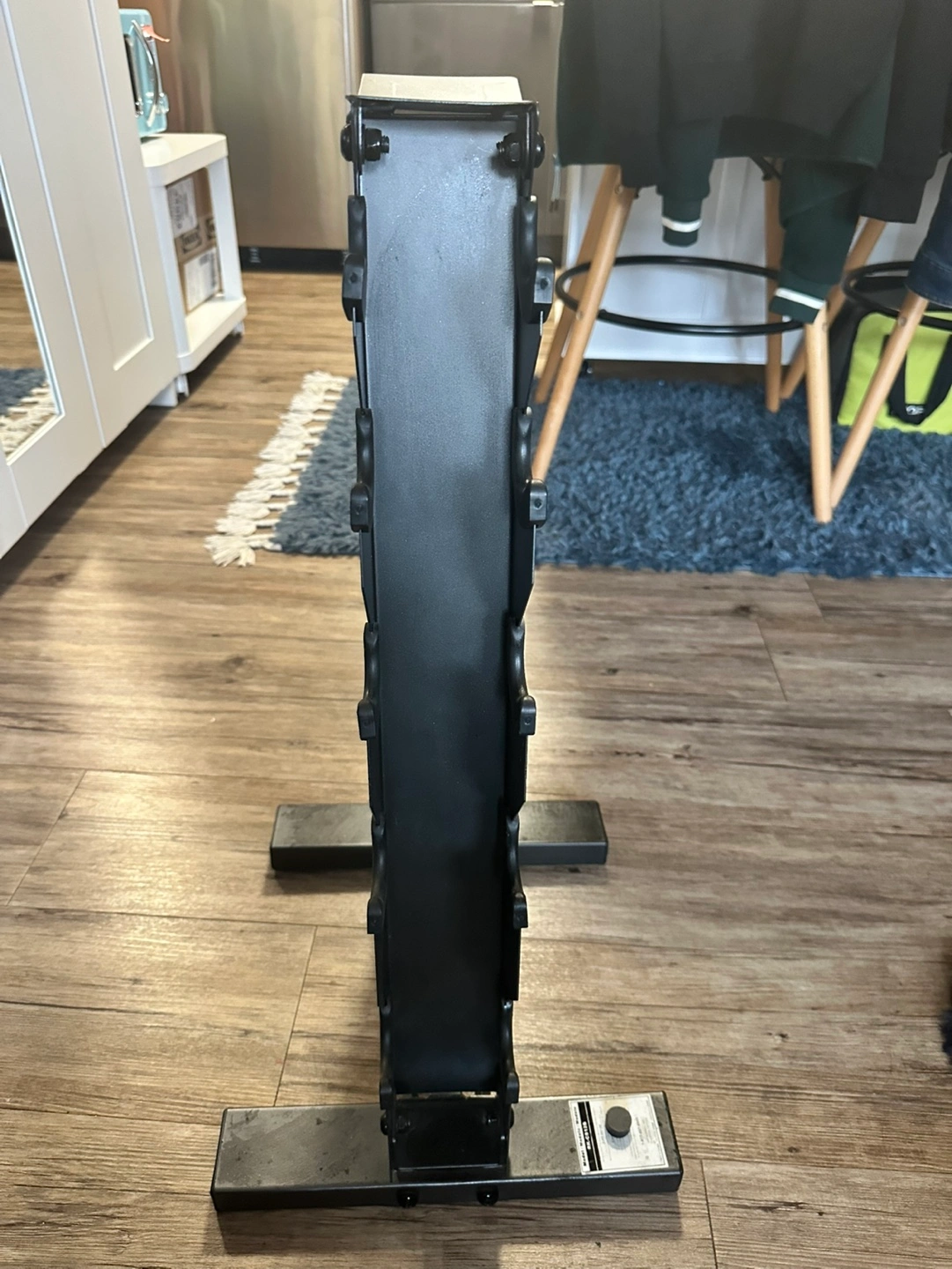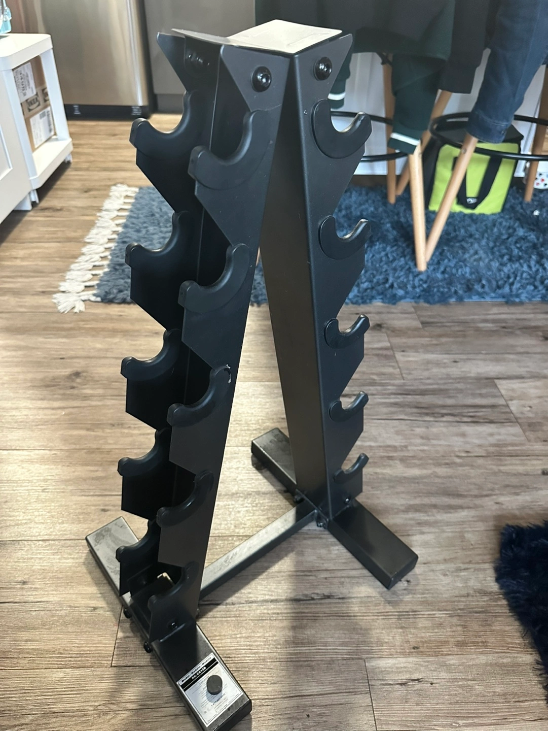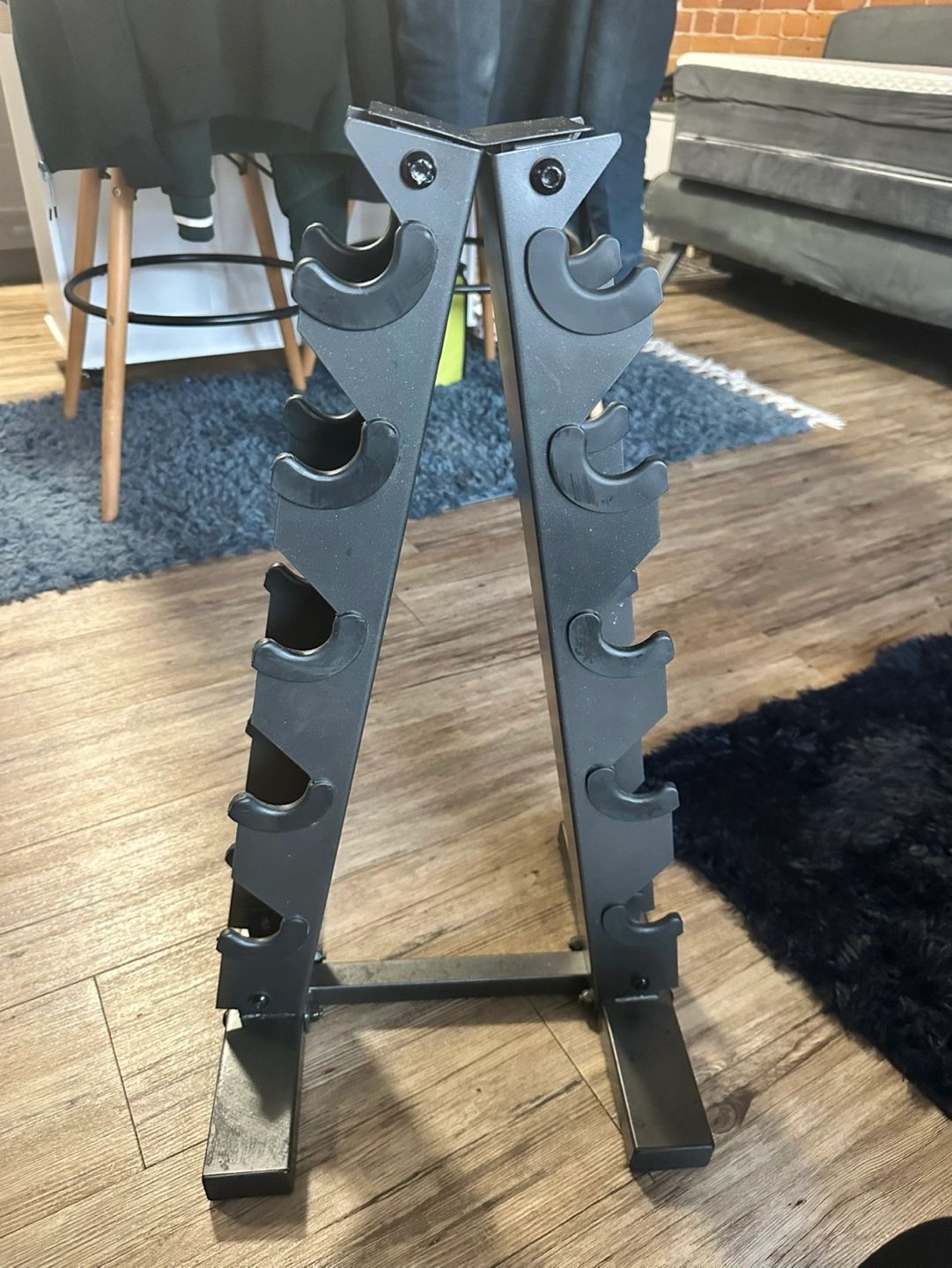 Dumbbell rack for storing dumbbells. Holds 5 pairs of dumbbells. Black.