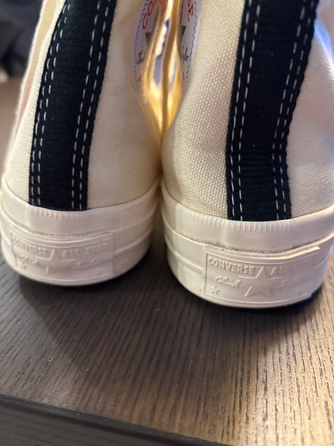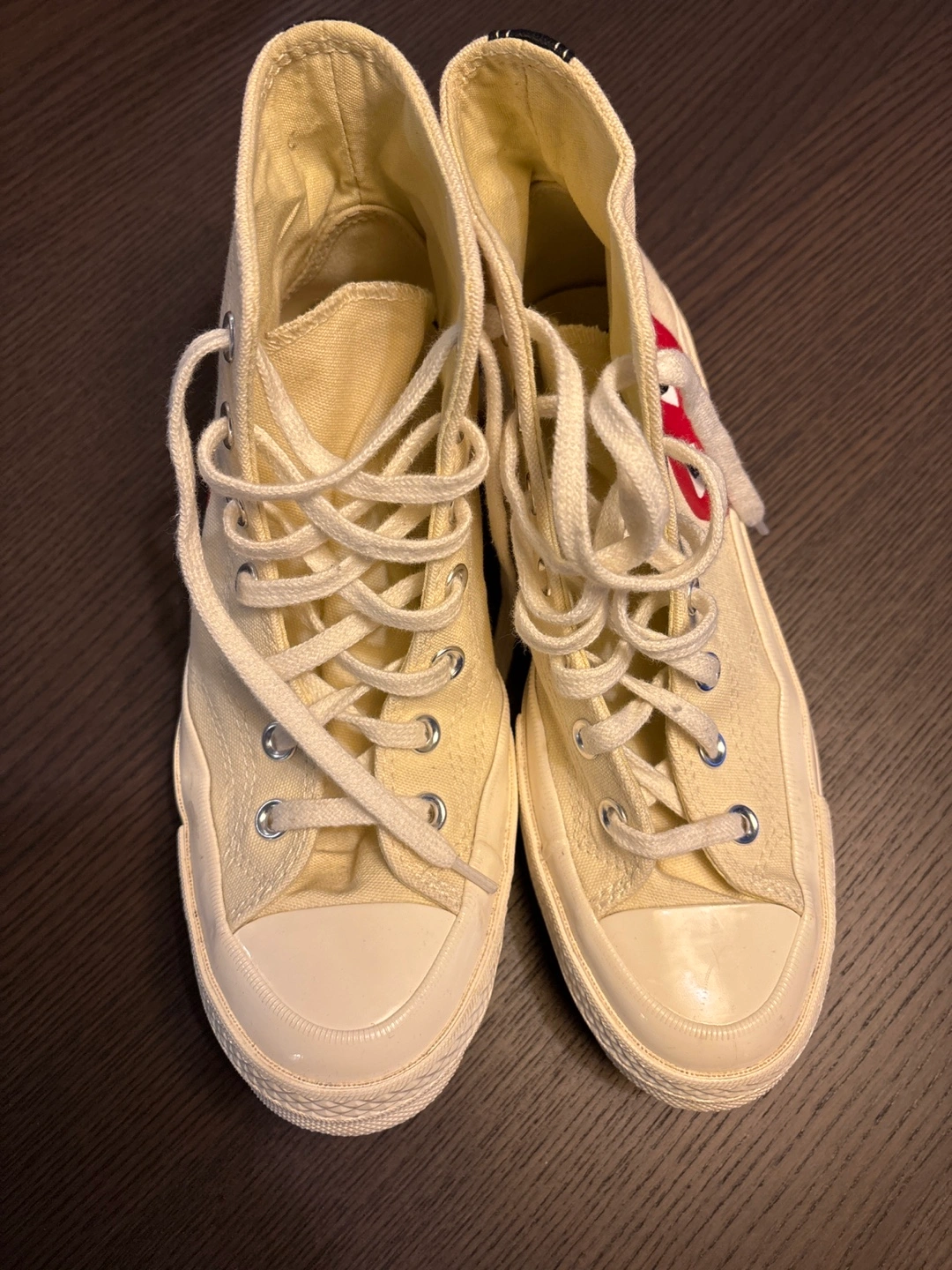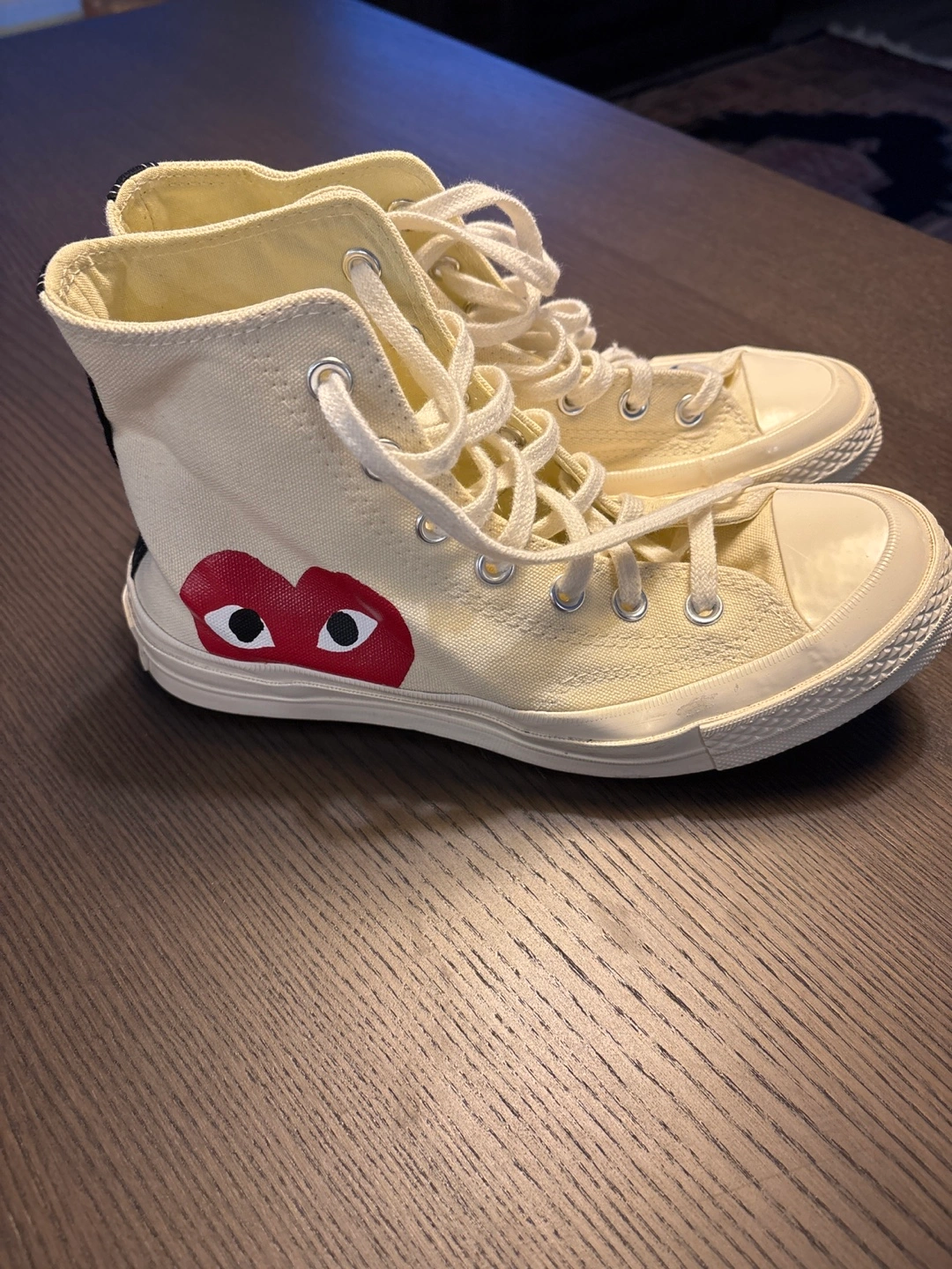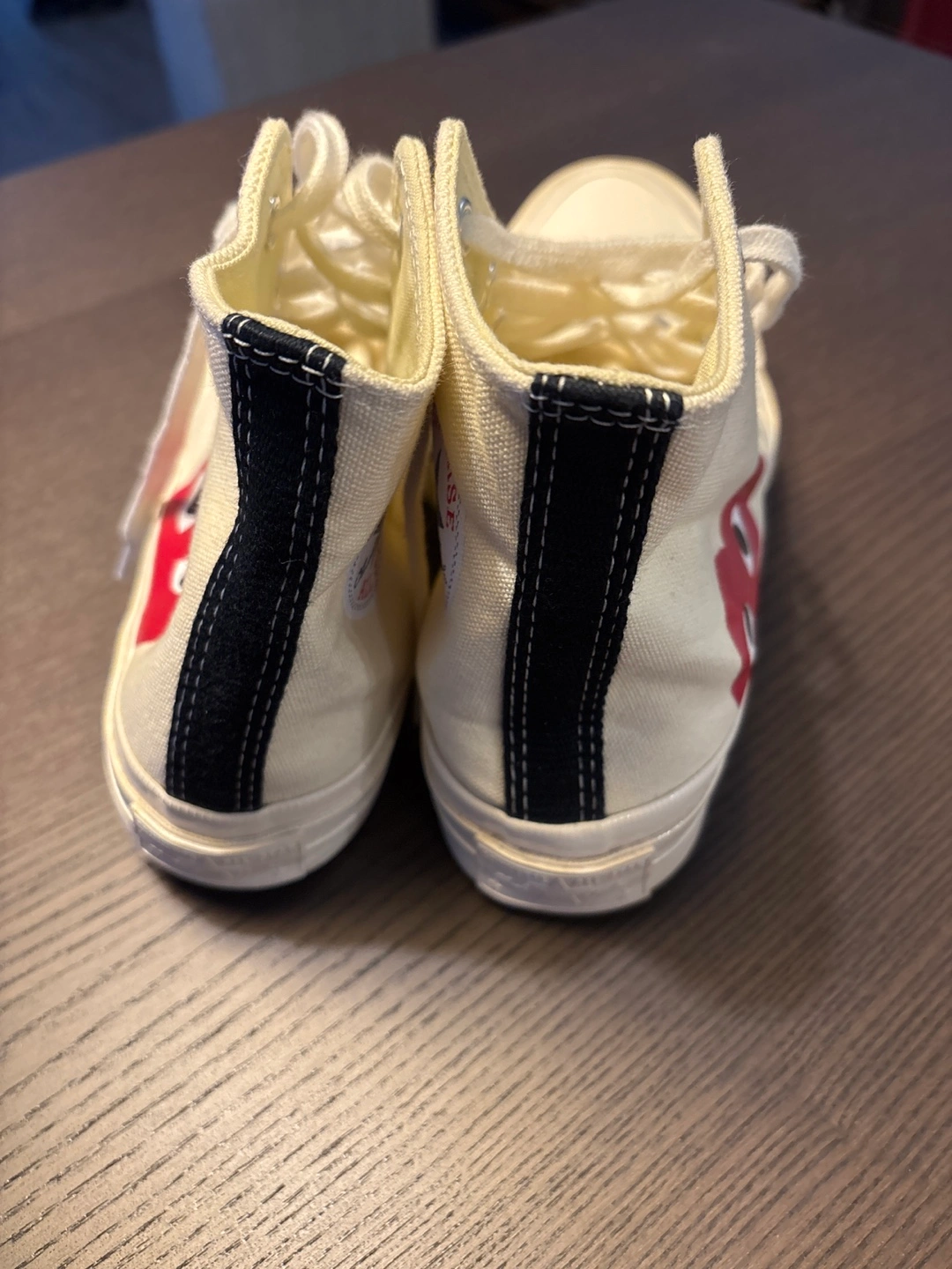 Cream canvas high top sneakers with a red heart and black stitching. Collaboration between Converse and Comme des Garçons. Usually retail between 160-200