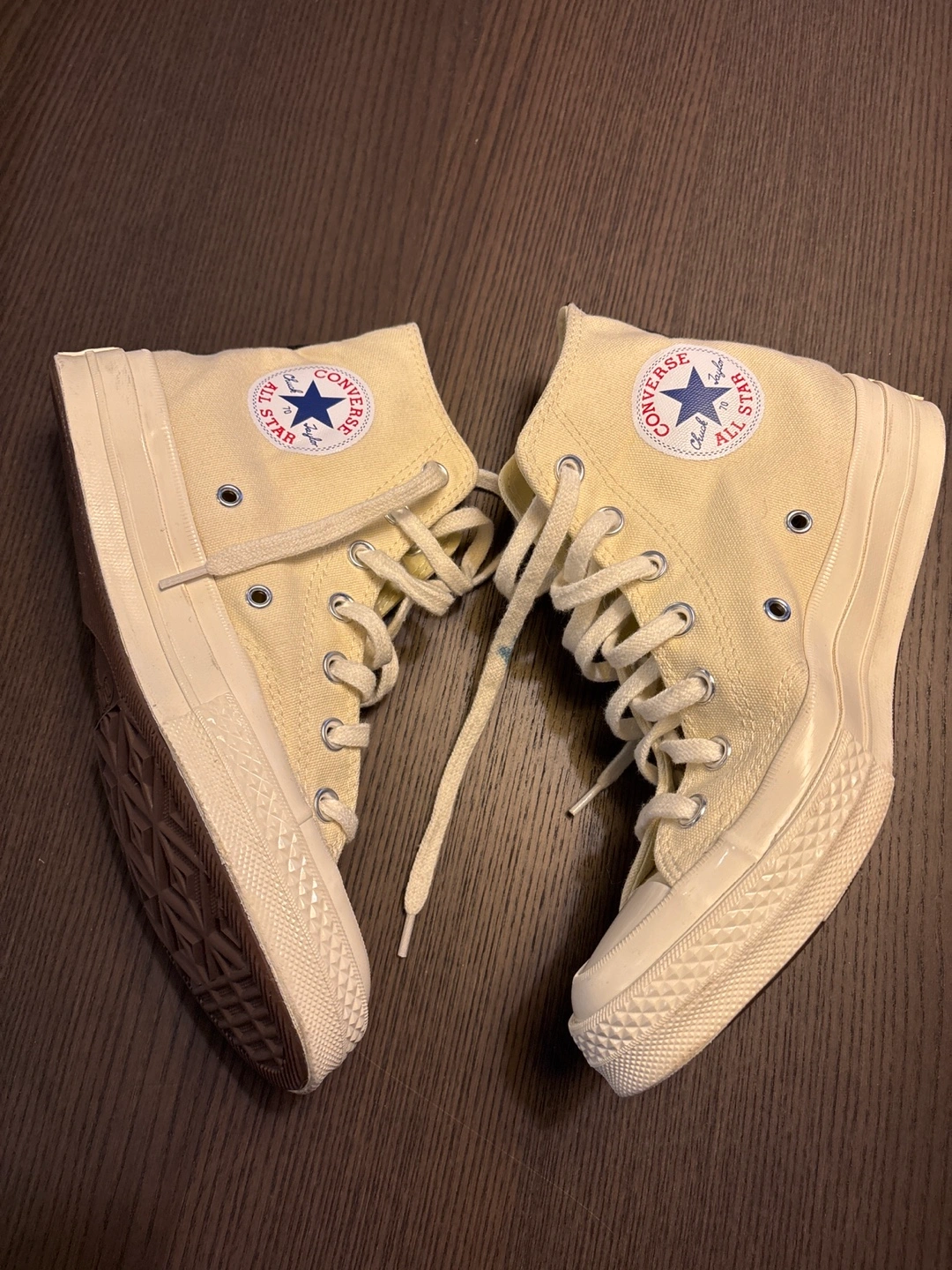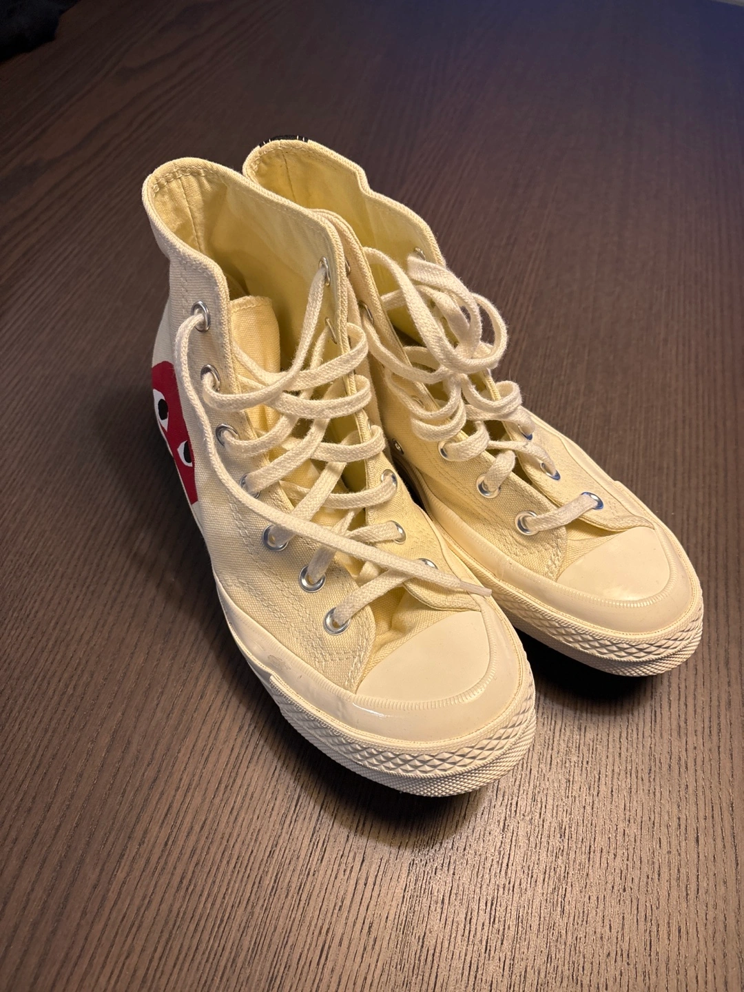Cream canvas high top sneakers with a red heart and black stitching. Collaboration between Converse and Comme des Garçons. Usually retail between 160-200