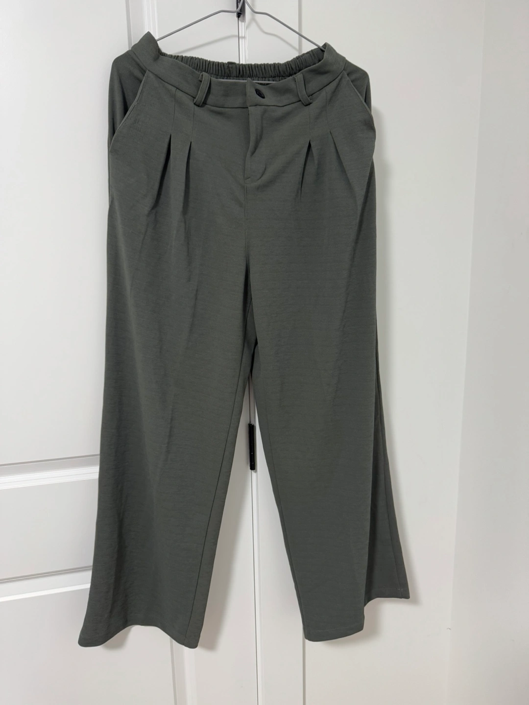 39Grey wide leg pants. Pleated front. Two pockets. Elastic waistband.