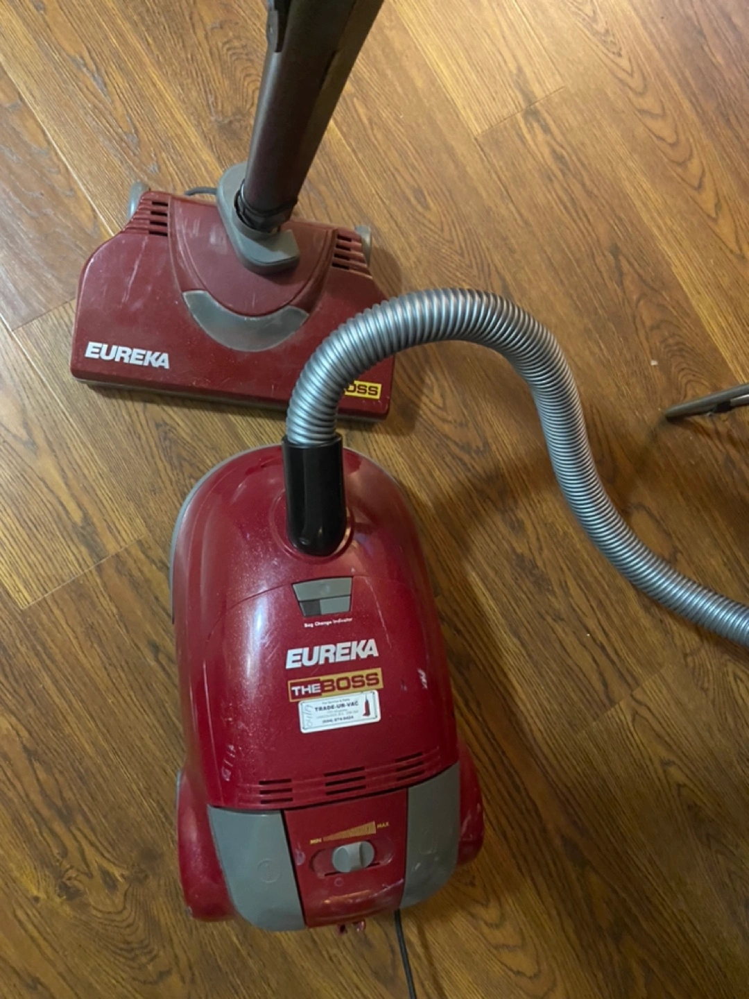407Red upright vacuum cleaner with a hose and attachments. Includes a power cord but it doesn’t go back all the way inside (retractable is broken)and needs new bag. …or best offer