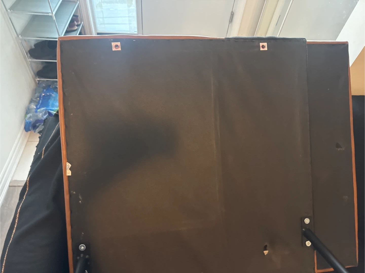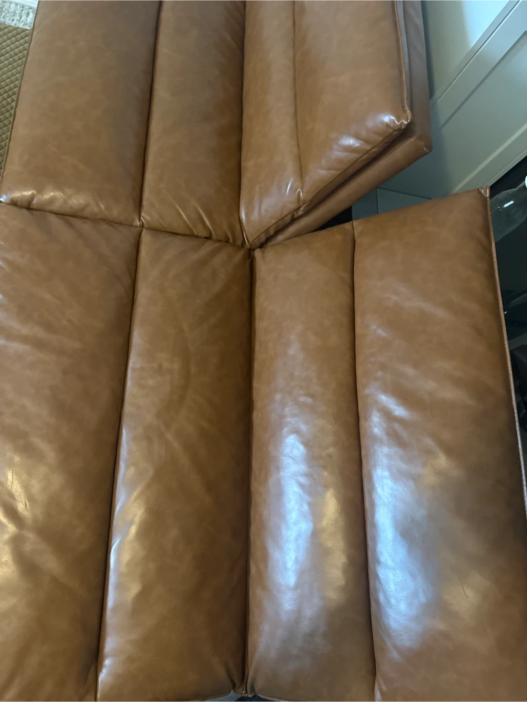 This bench ottoman is upholstered in brown faux leather. It's designed with a tufted top and has black metal legs. Perfect for adding extra seating or as a footrest. smoke free pet free. More information asked me