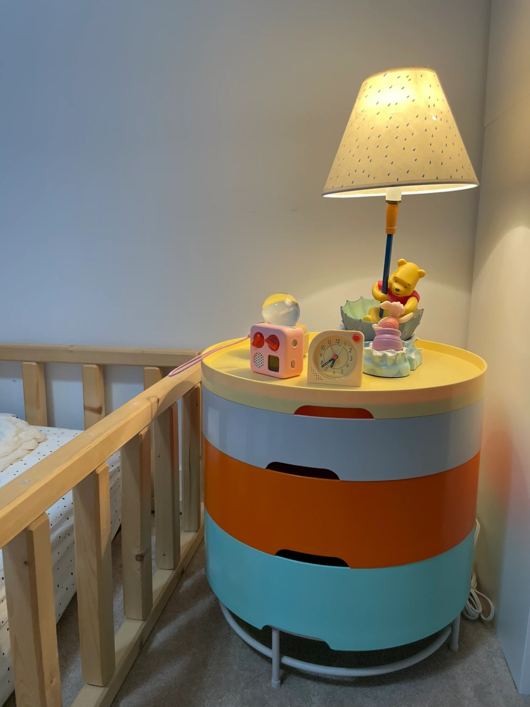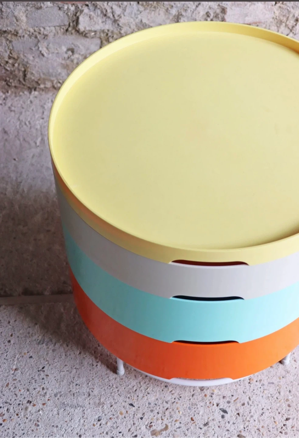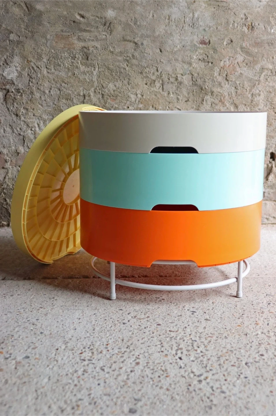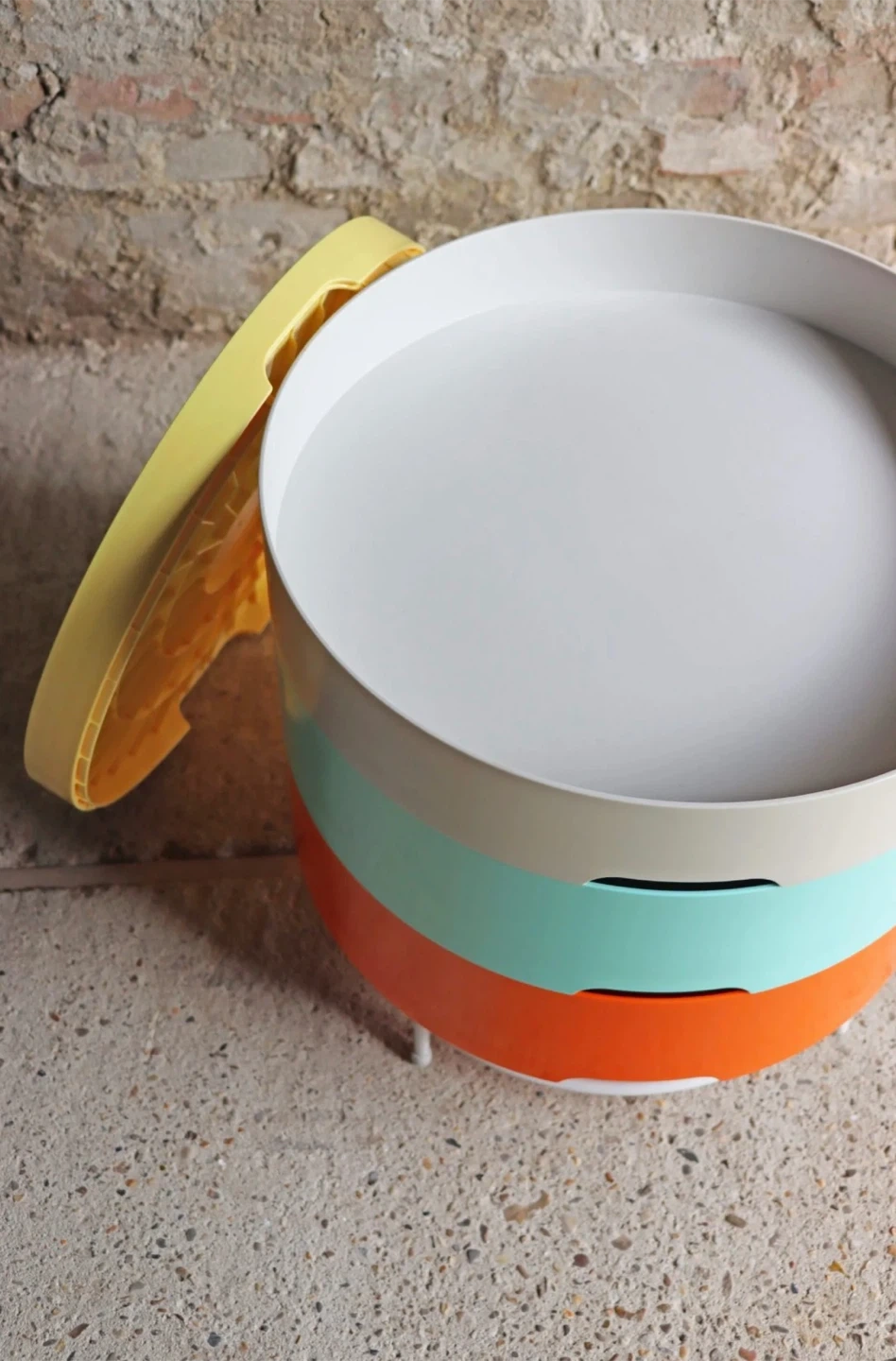 This fun and practical storage table has 4 separate plastic compartments which you can stack in any desired order on the metal base. Very handy for storing small items lying around! In completely new condition. Designed by T. Richardson, C. Brill & A. Williams. Diameter 44 cm, Height 45 cm.