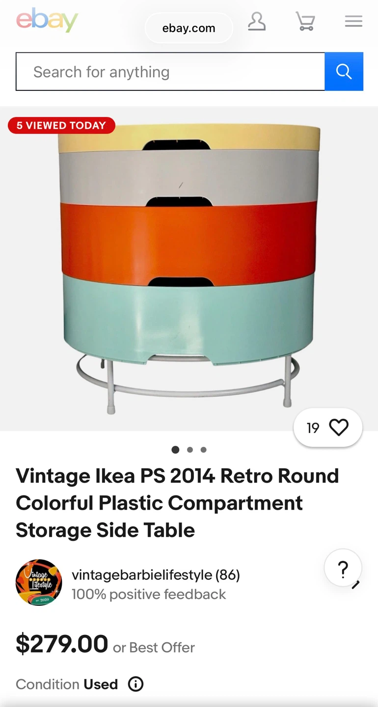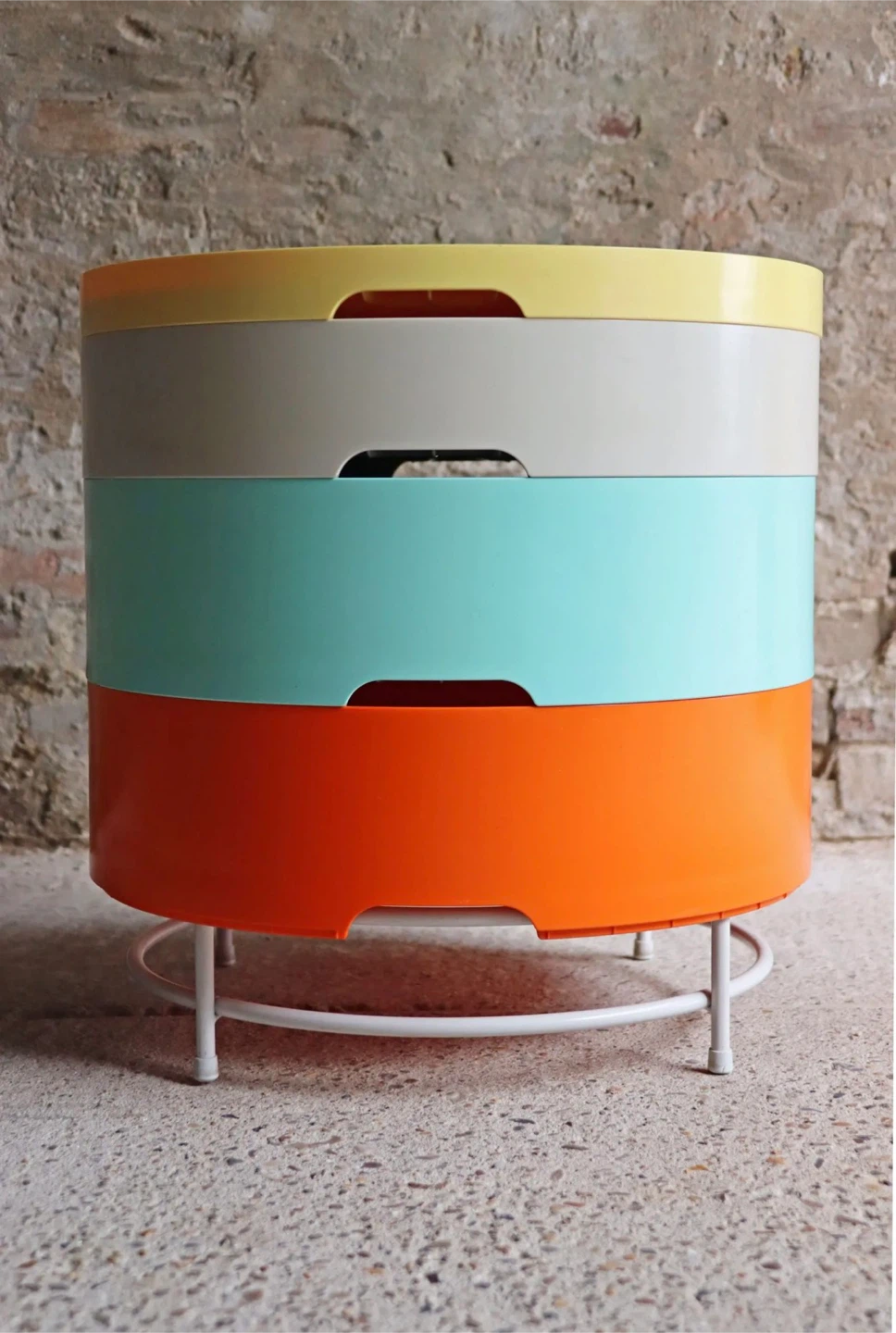This fun and practical storage table has 4 separate plastic compartments which you can stack in any desired order on the metal base. Very handy for storing small items lying around! In completely new condition. Designed by T. Richardson, C. Brill & A. Williams. Diameter 44 cm, Height 45 cm.