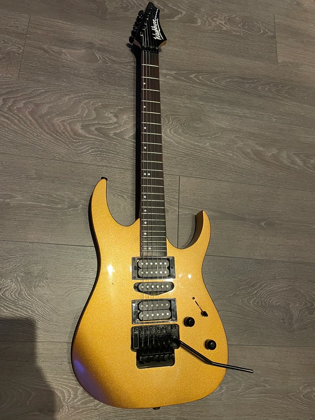 High quality stylish electric guitar in rare gold finish with a beautiful neck. There is a very small dent on the side, not so visible. please refer to picture. Clean and excellent condition.