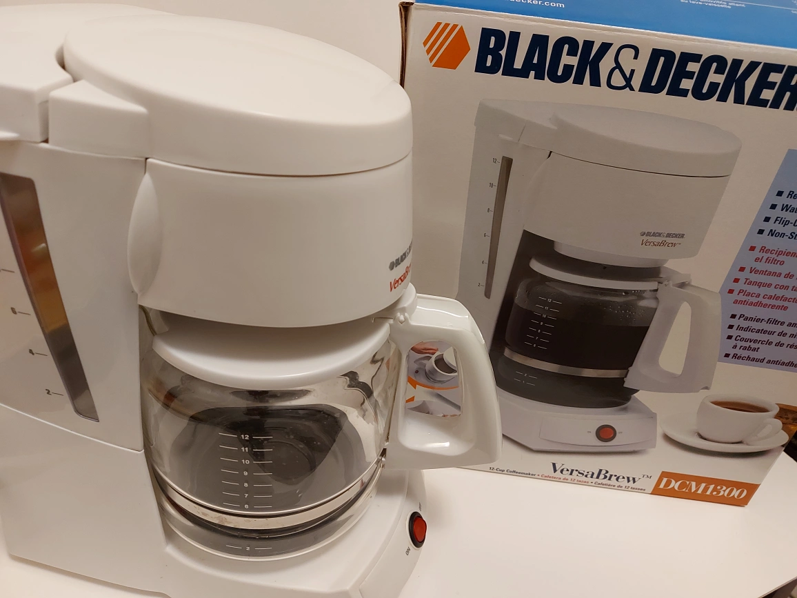 White coffee maker with glass carafe. Includes removable filter basket, flip-up reservoir cover, non-stick keep hot plate, water window, and a removable filter basket. Pristine condition.