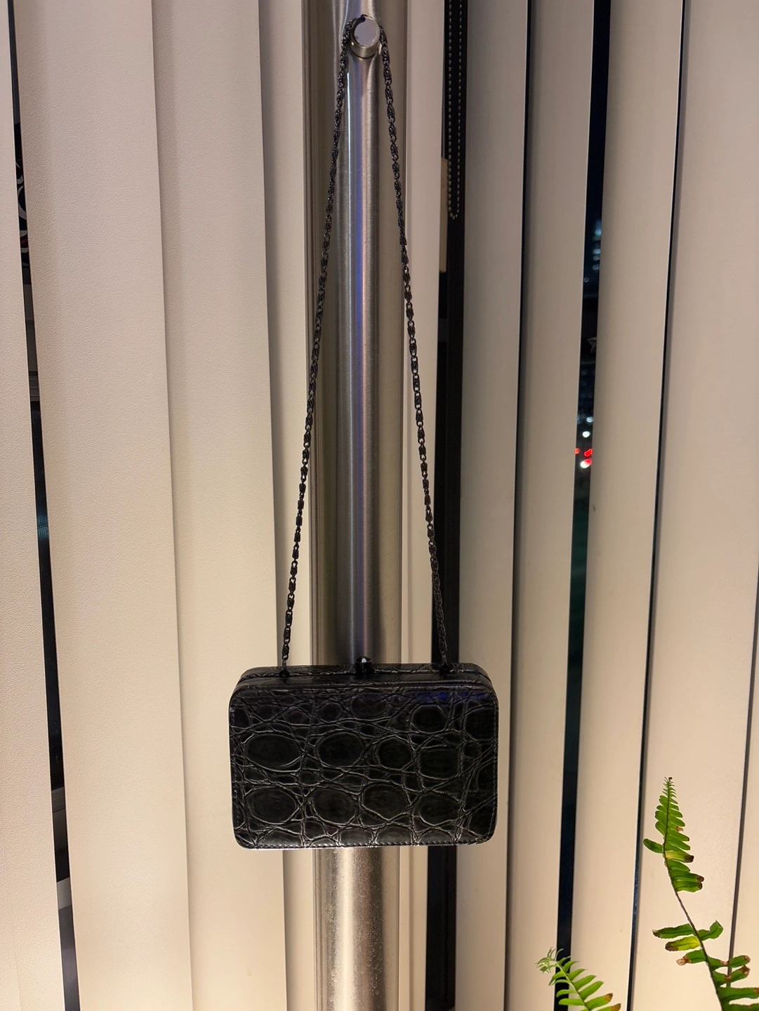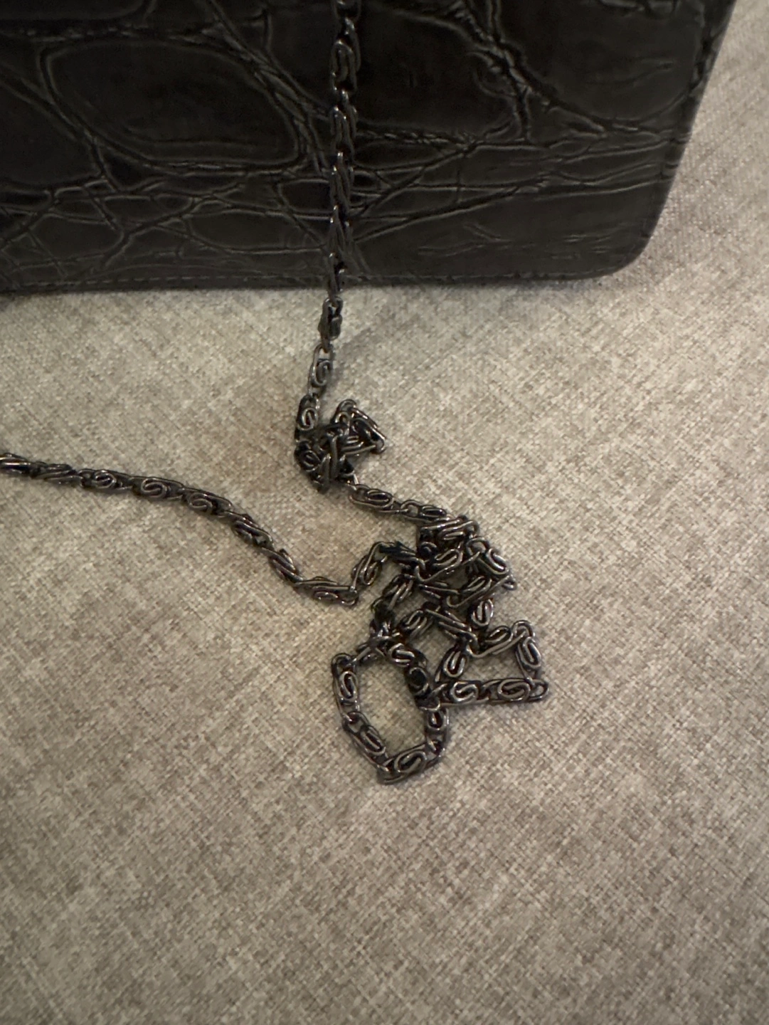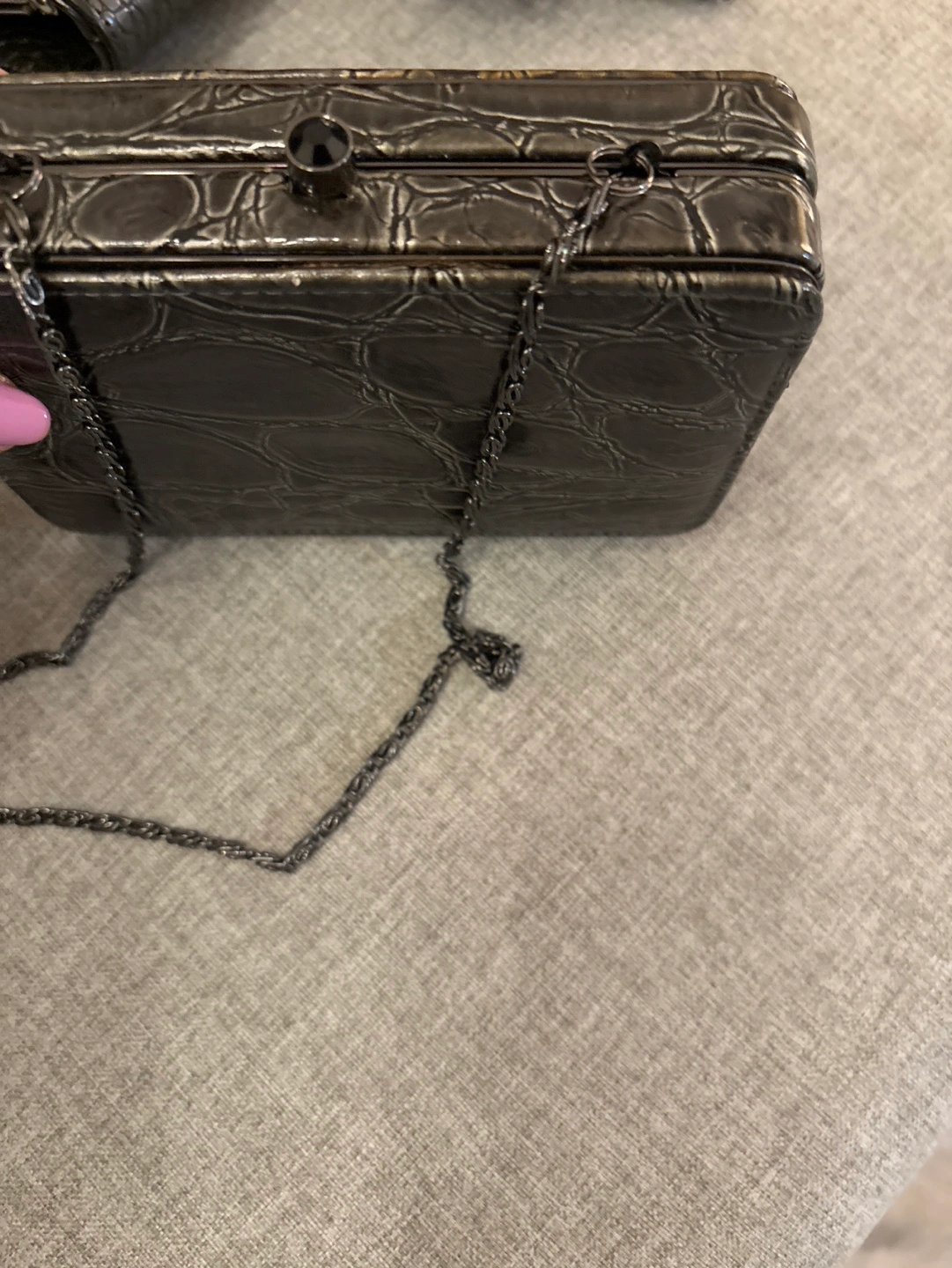 Black clutch with a chain strap, featuring a crocodile pattern. Has a clasp closure.