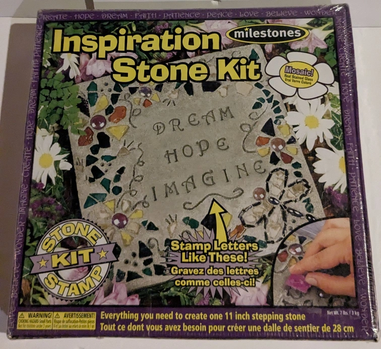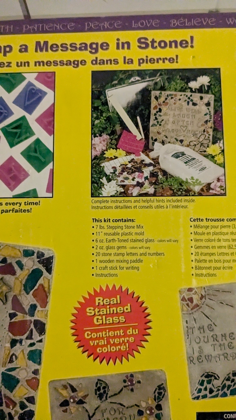 Stamp a message in stone. Includes everything needed to create a 11 inch stepping stone. Mosaic. Real Stained Glass. True Stone Color.
