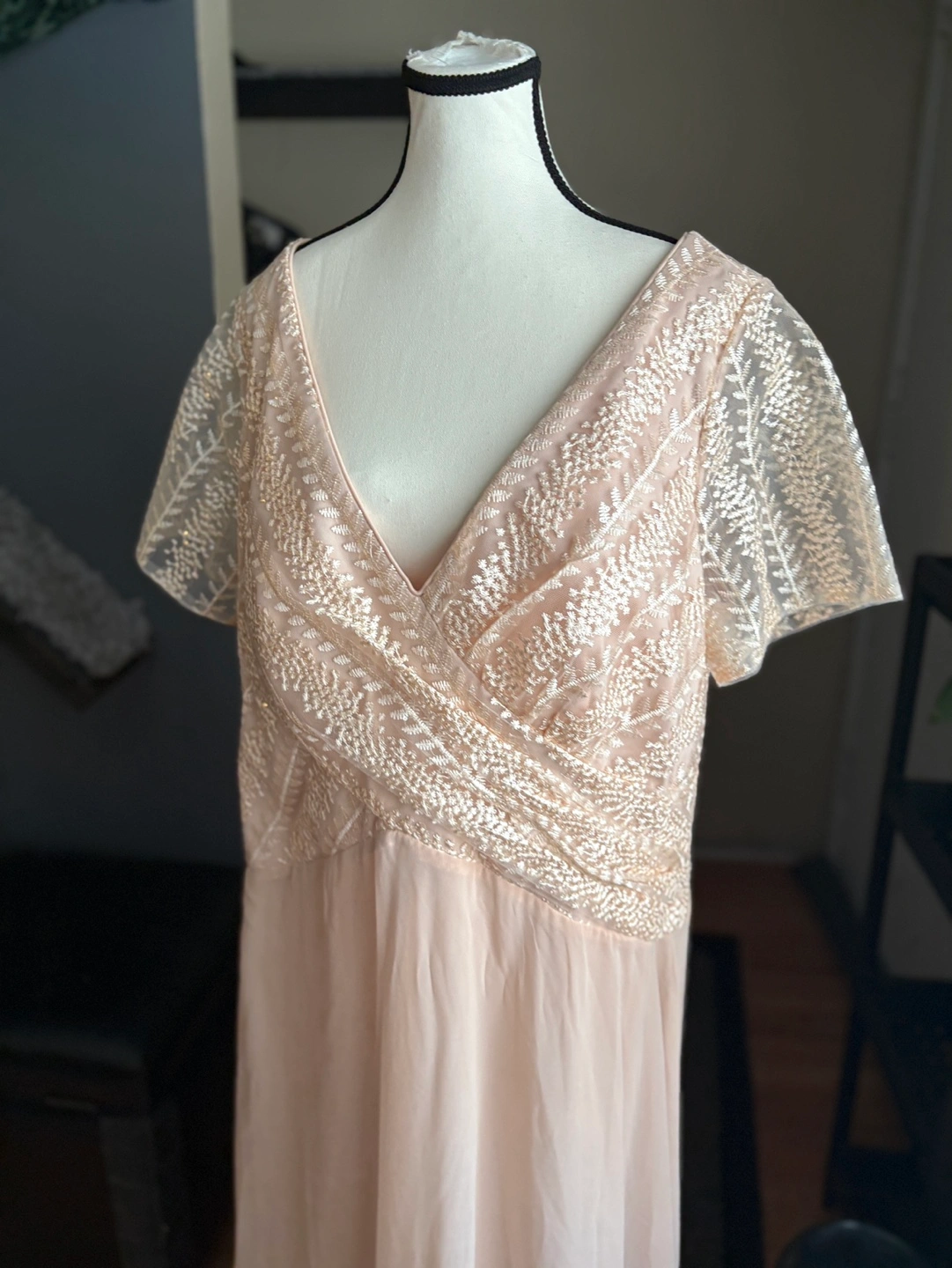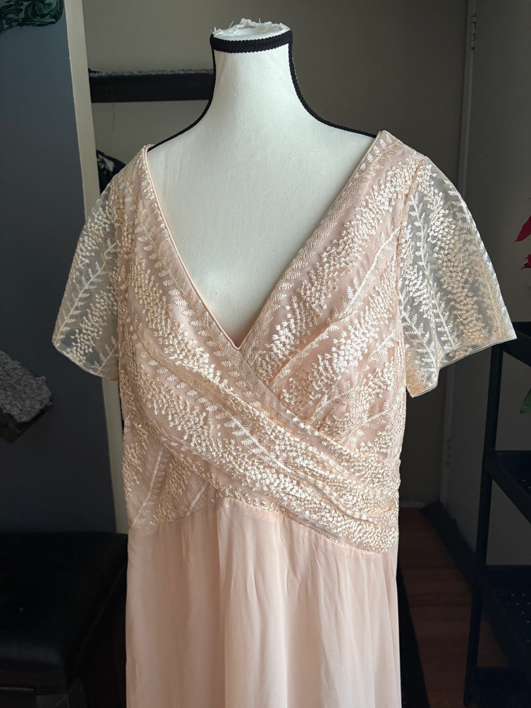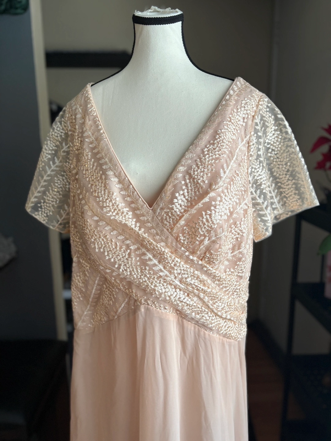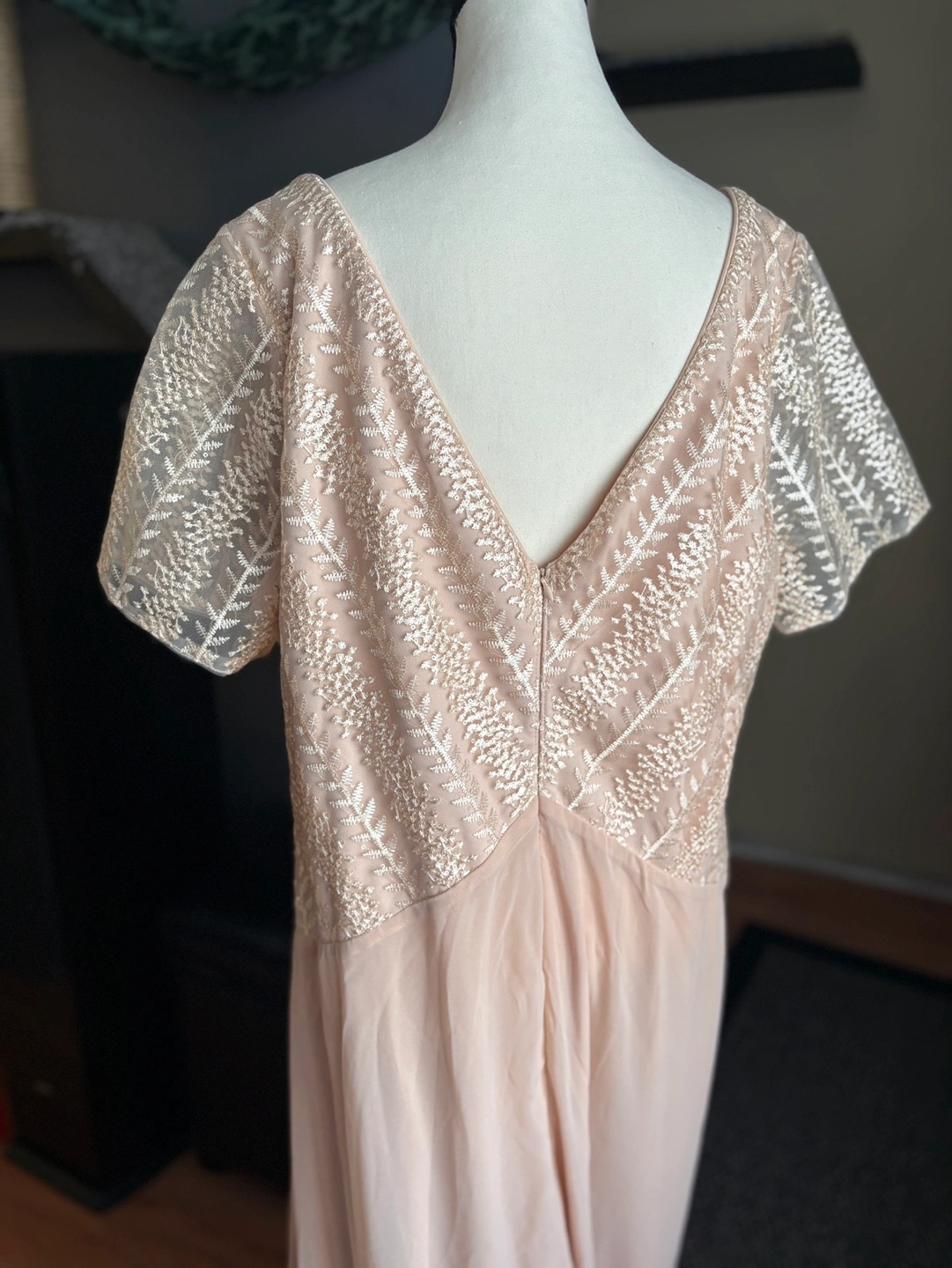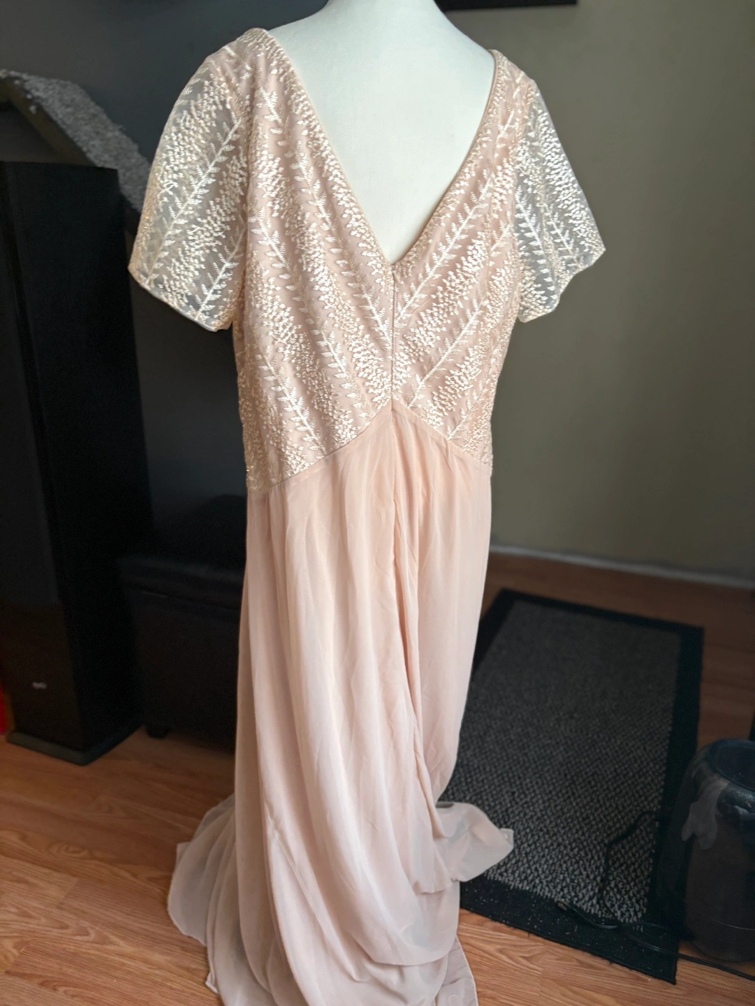 Formal, flowy pink dress with embroidered details. V-neck and short sleeves. Zip up back Shein Curve 4XL