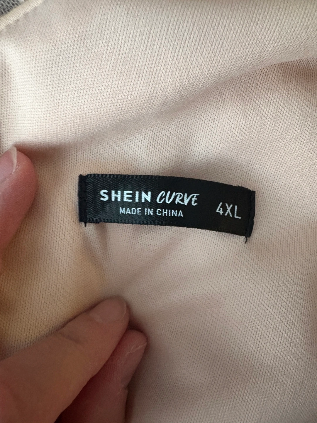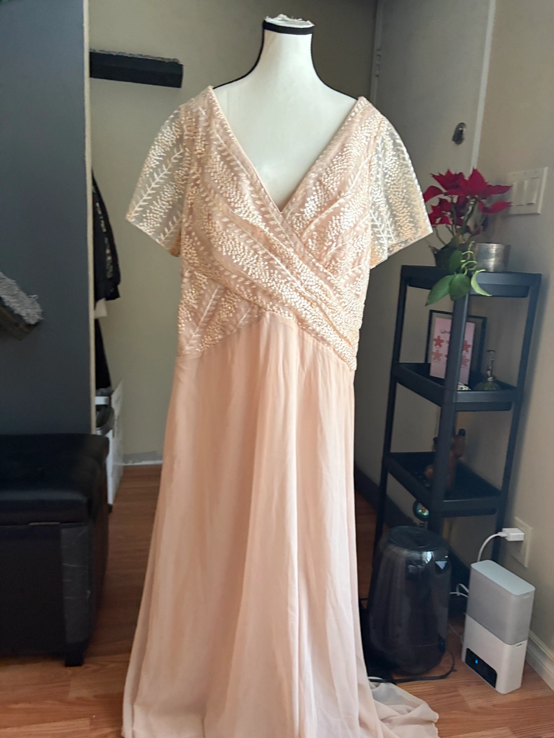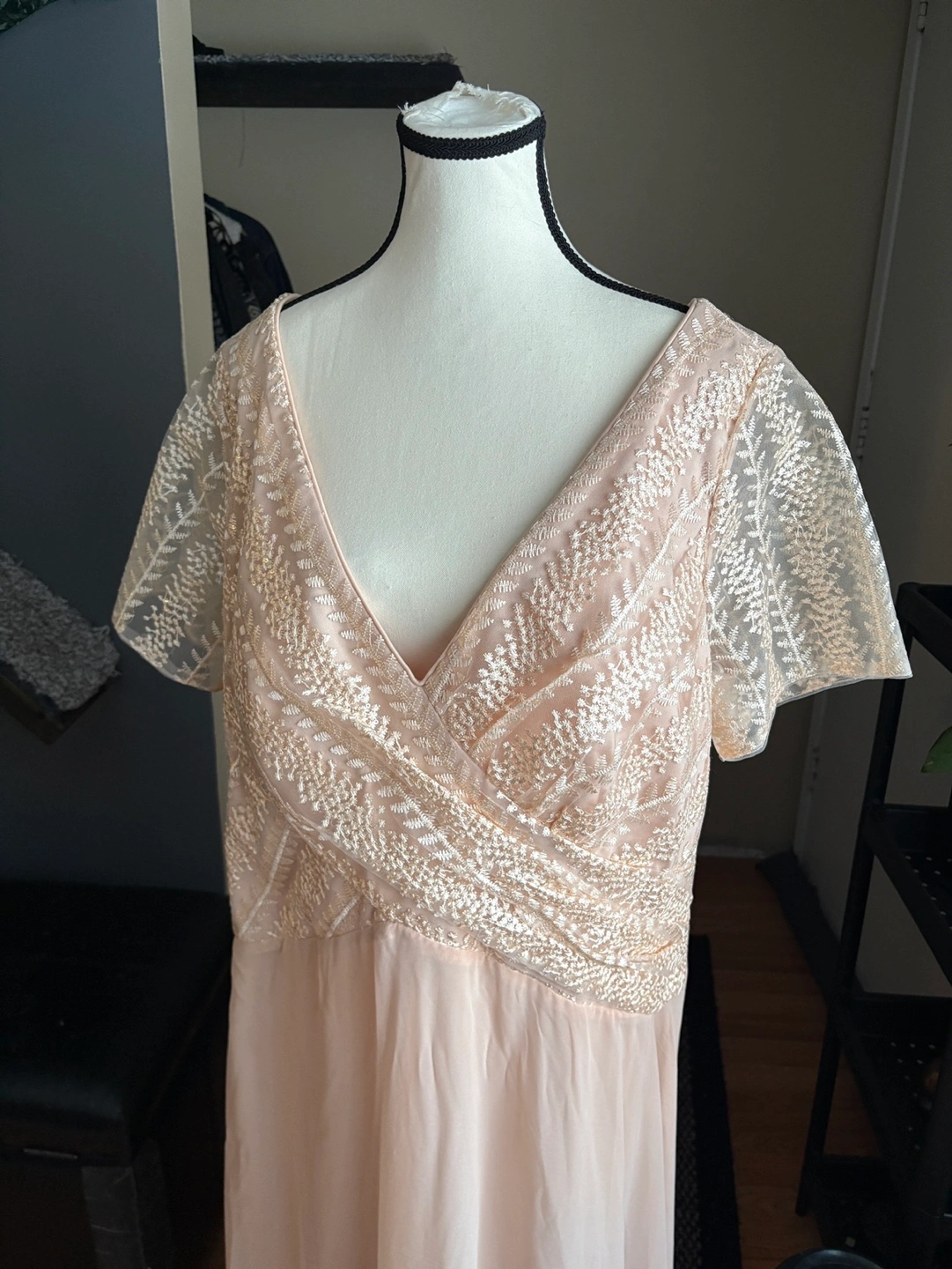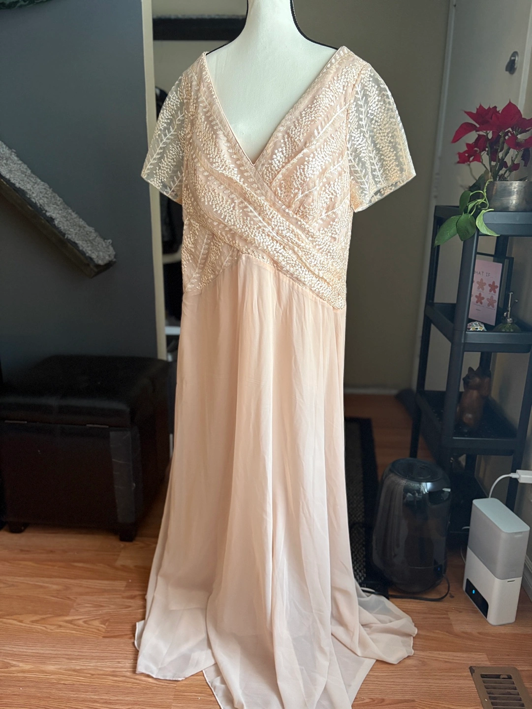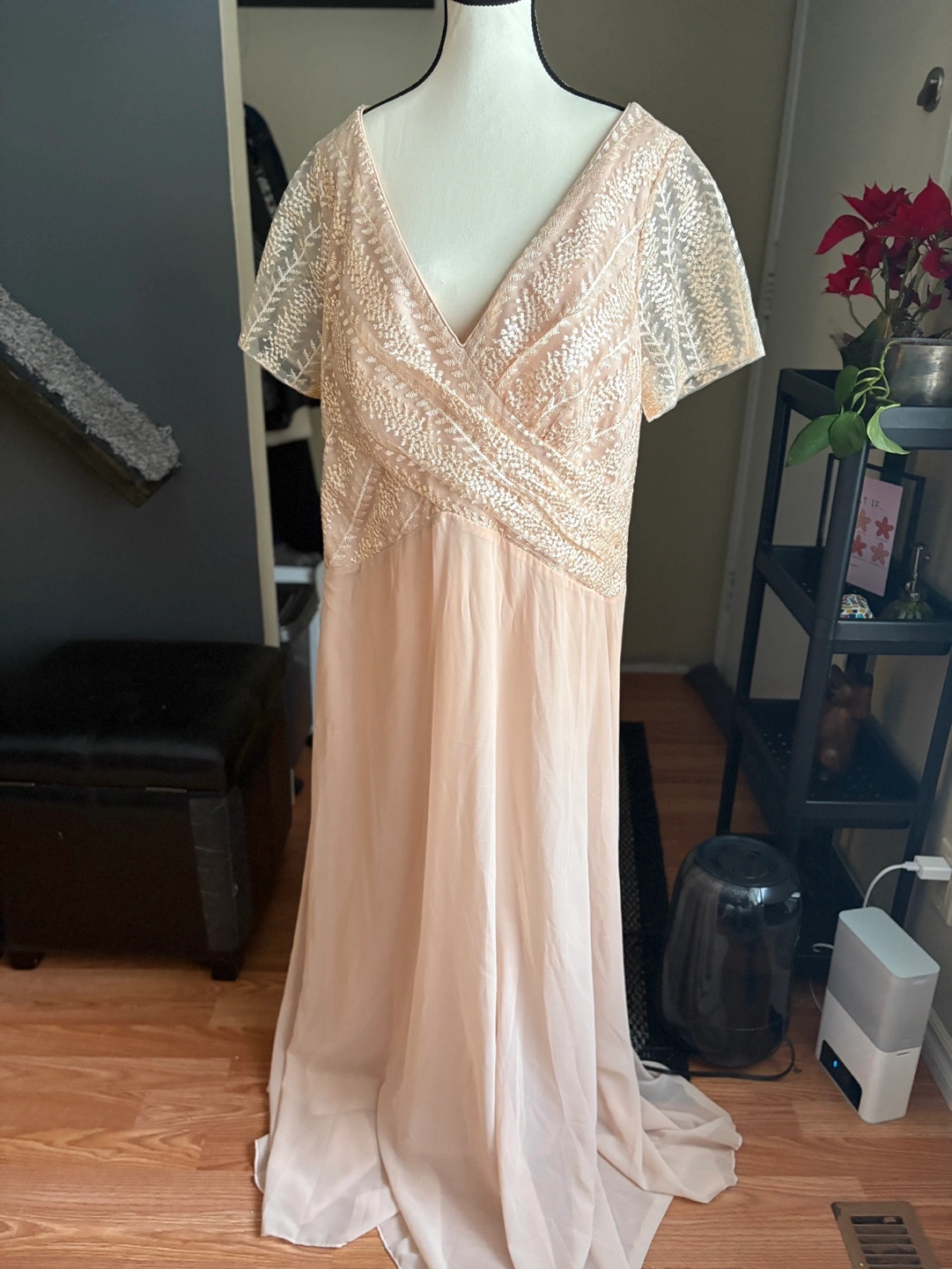 Formal, flowy pink dress with embroidered details. V-neck and short sleeves. Zip up back Shein Curve 4XL
