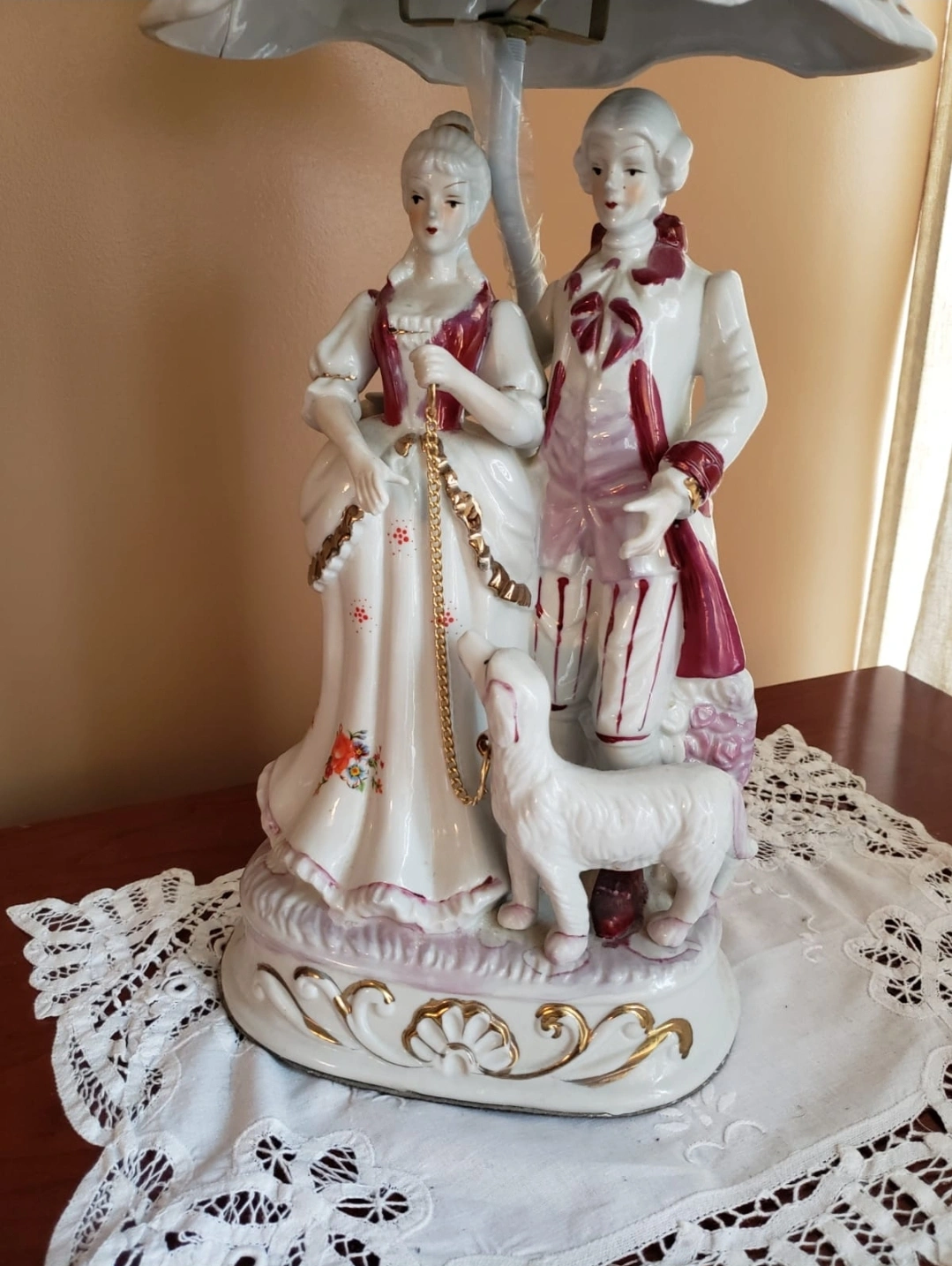a pair of beautiful vintage porcelain table lamps. Features a pair of elegantly dressed figurines and a lovely ornate lampshade. Perfect for adding a touch of vintage charm to your home decor. Shows some minor signs of wear consistent with age.