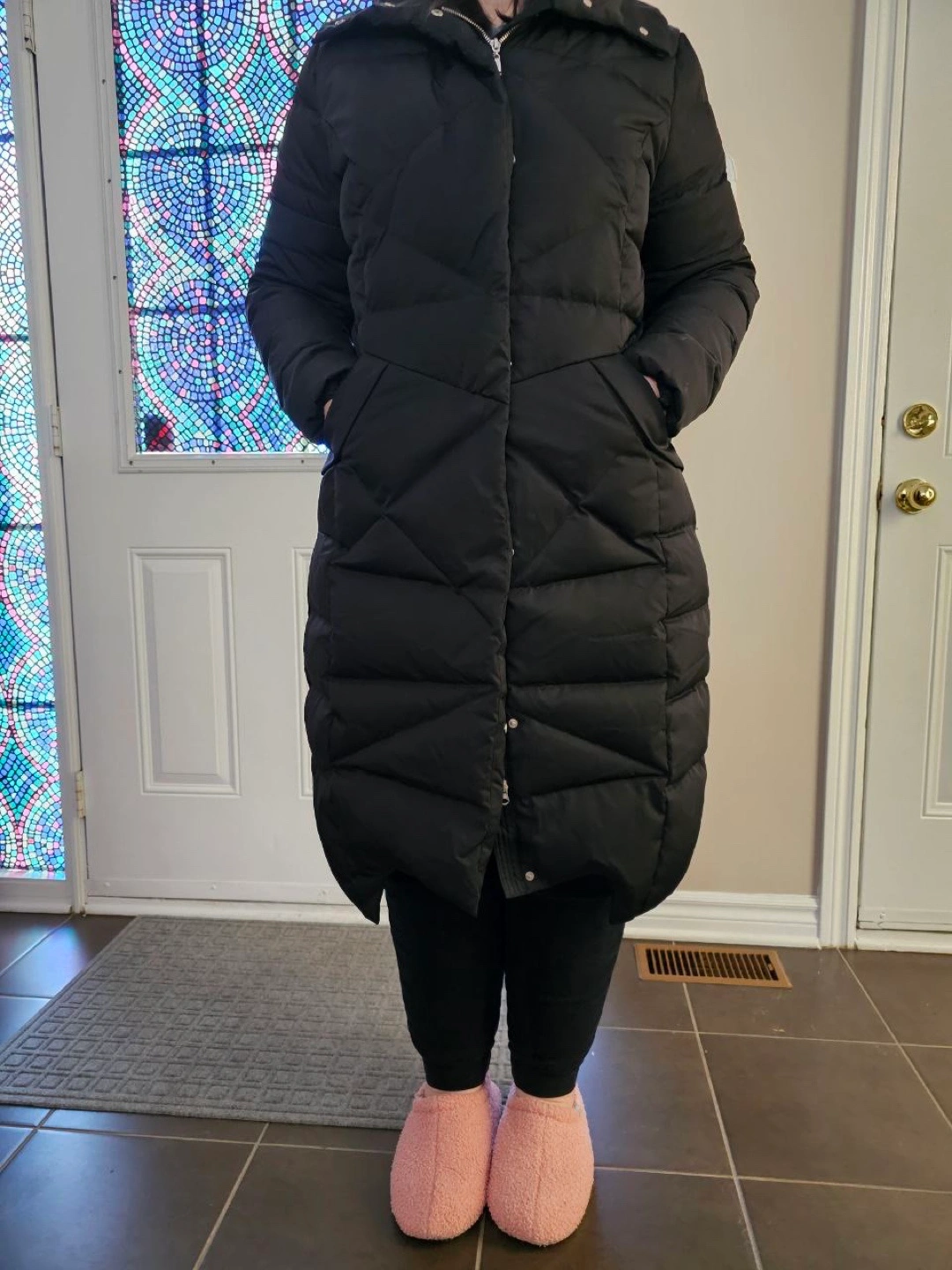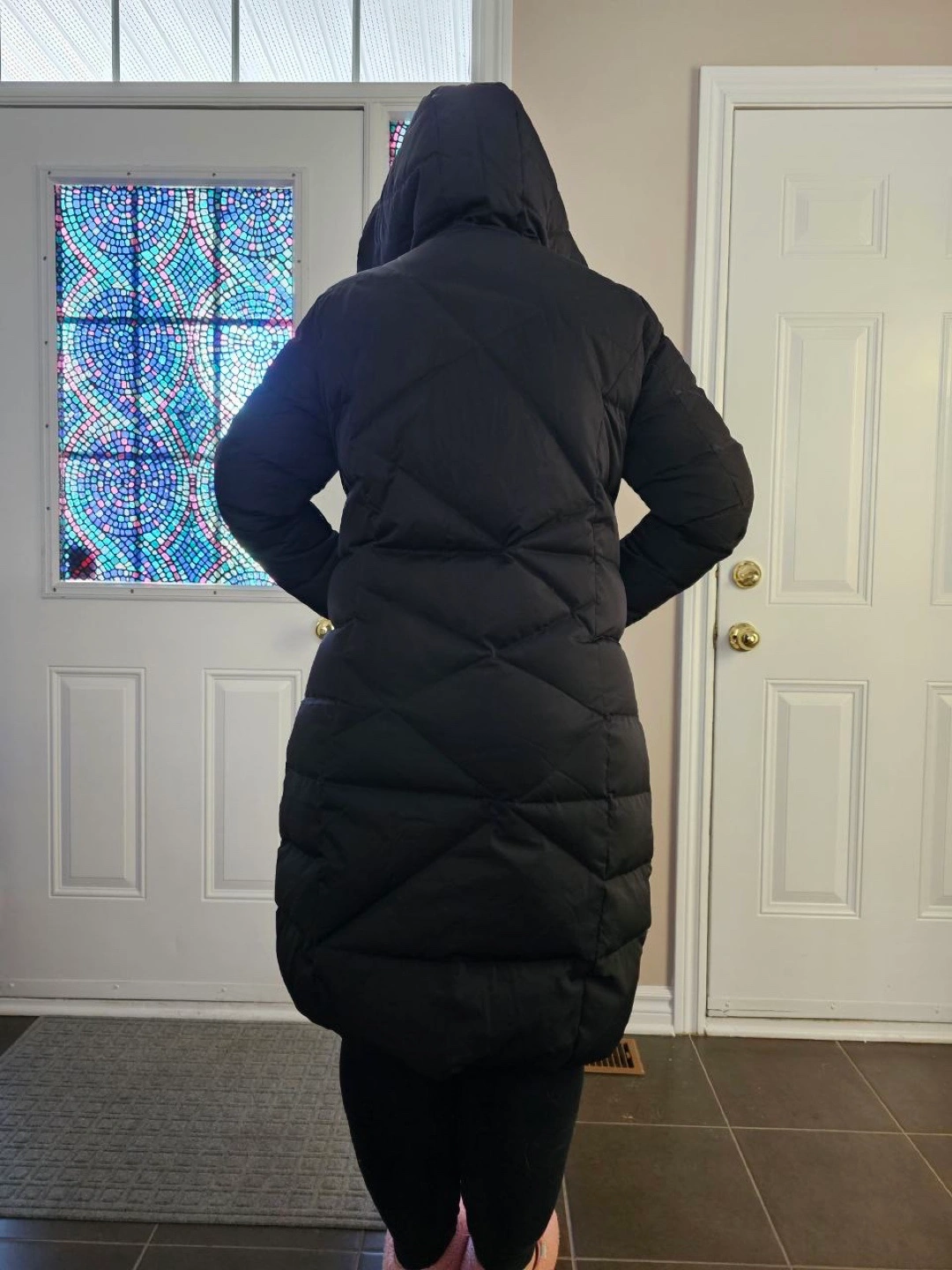 Warm winter coat. Long length, black colour. Features a hood and zipper closure. Multiple pockets. Diamond quilted pattern.