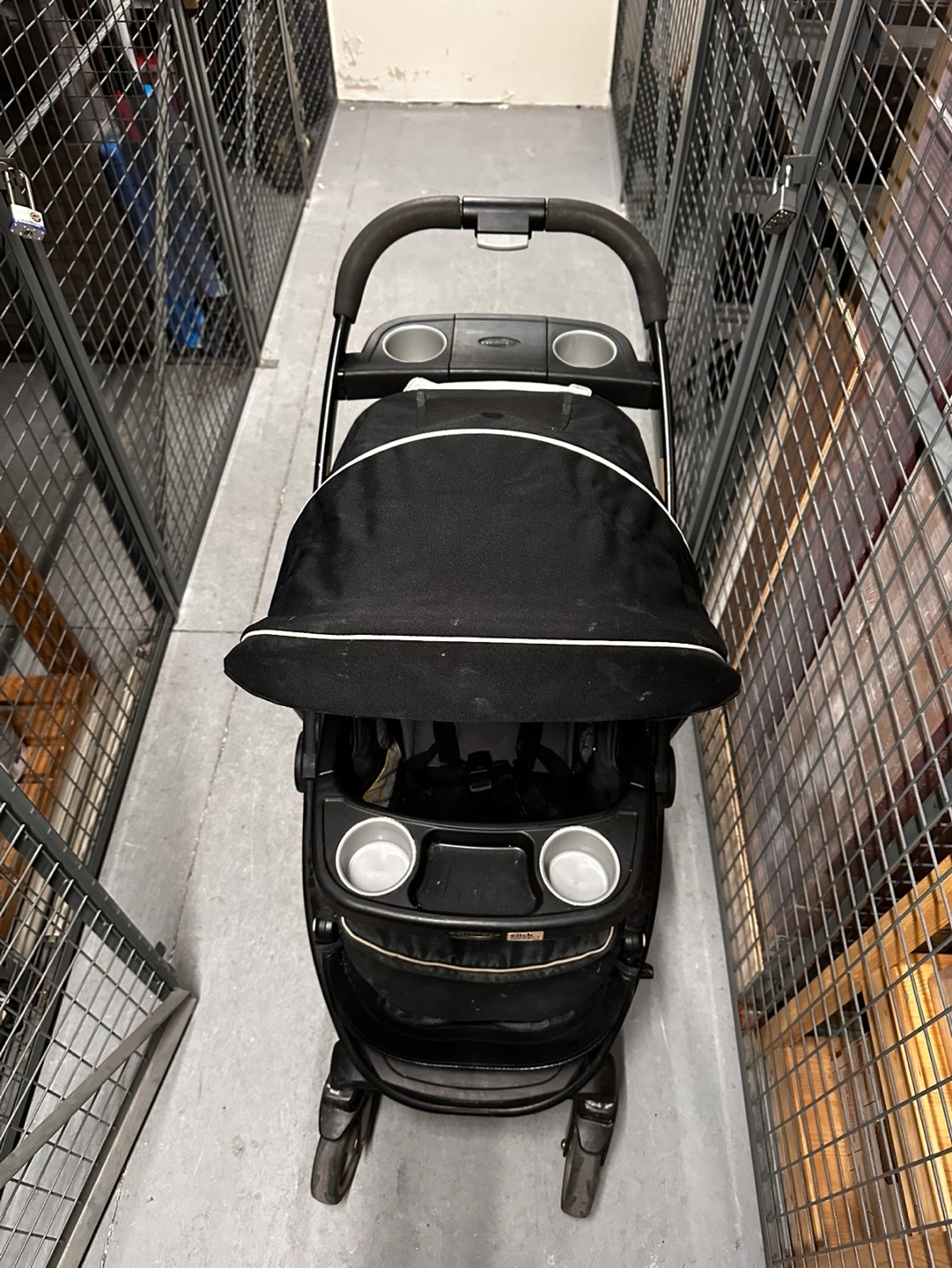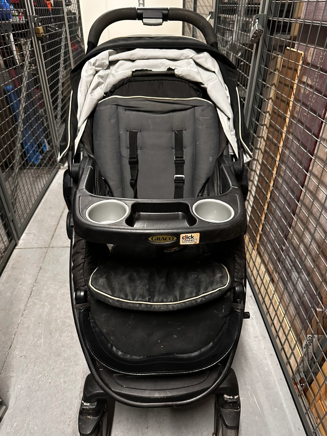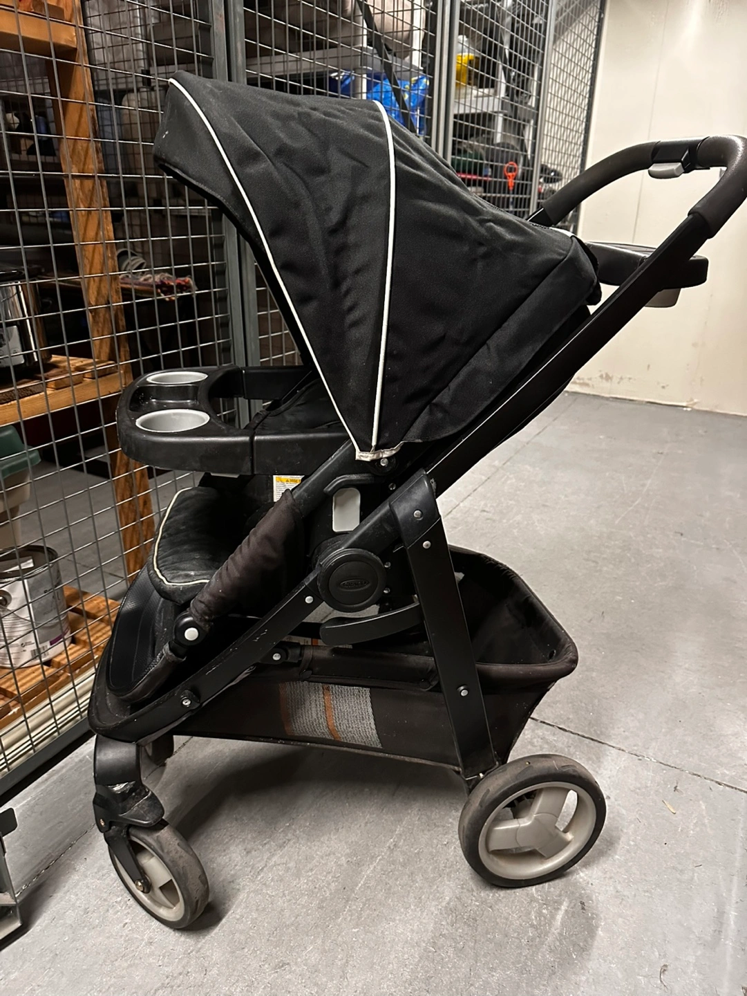 Used Graco stroller. Black with grey accents. Features cup holders and storage basket. Suitable for one child. Shows some wear.