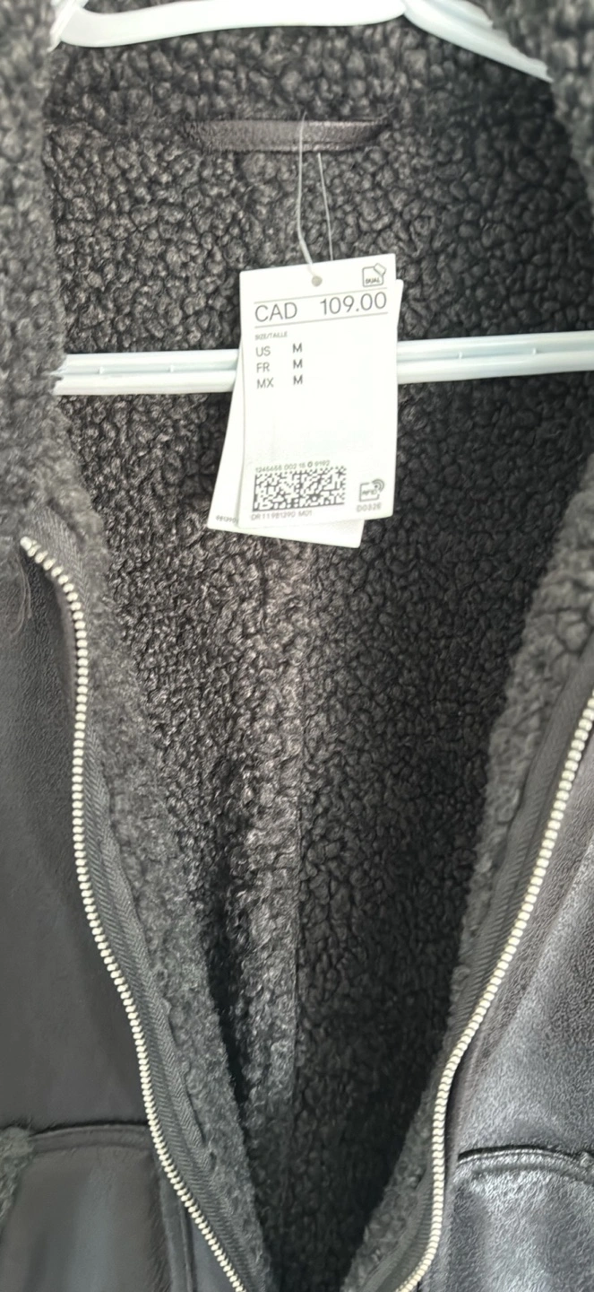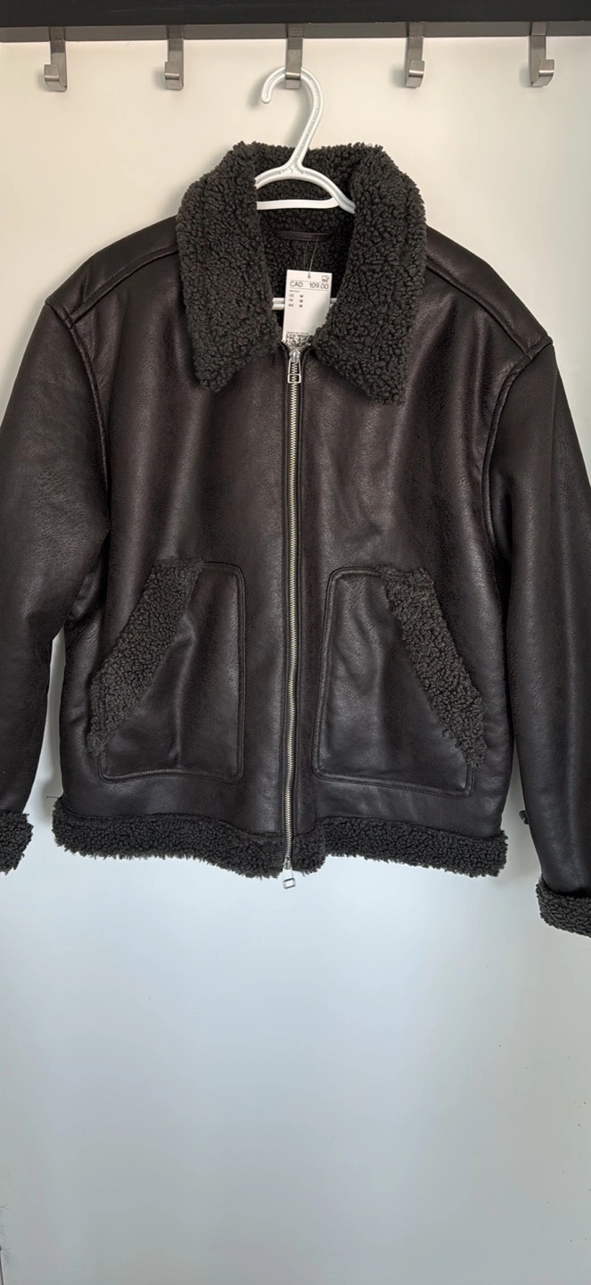 19Warm and stylish jacket. Features a faux leather exterior and a cozy sherpa lining. Zip closure and pockets. Size medium. Excellent condition.