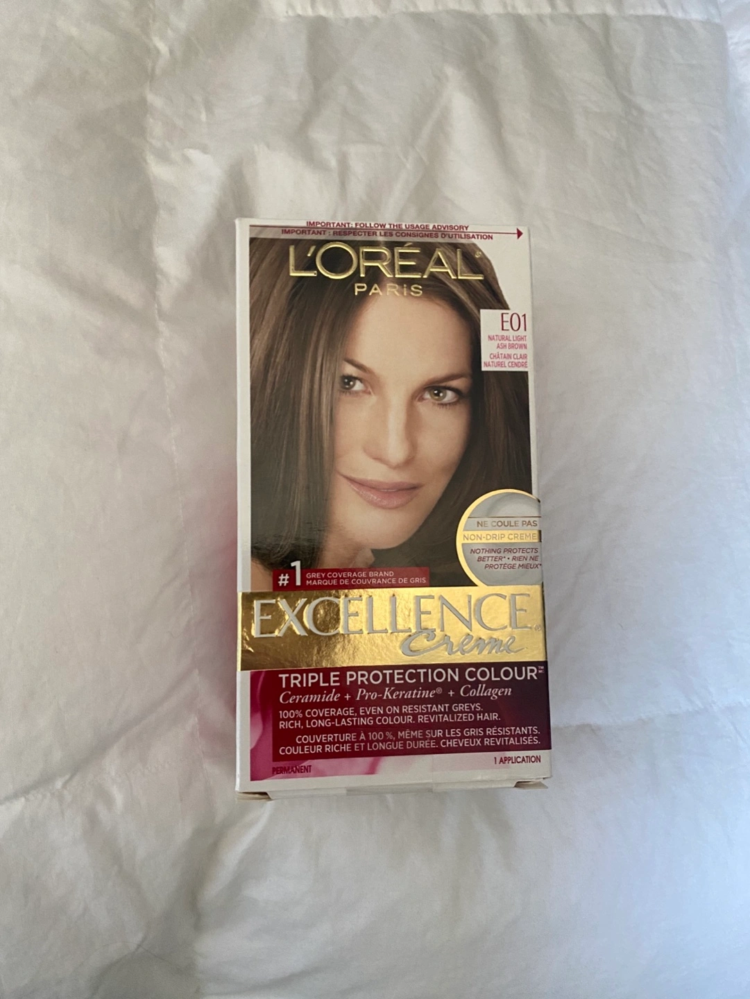 250New, unopened box of L'Oréal Paris Excellence Crème hair colour. Shade E01 Natural Light Ash Brown. Triple protection colour with ceramide, pro-keratine, and collagen. 100% grey coverage. Permanent colour.