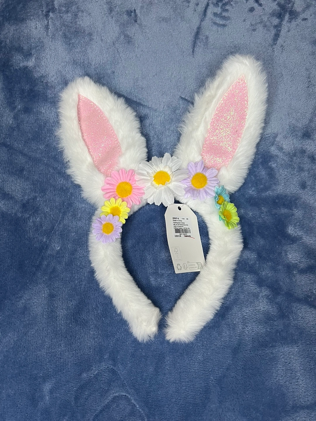 Adorable bunny ear headband. Features soft white fur, pink glitter inner ears, and pastel flowers.