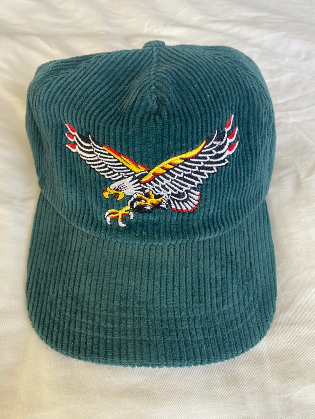 Dark green corduroy baseball cap. Features embroidered eagle design on the front. 'Indestructible' embroidered on the back. Adjustable.