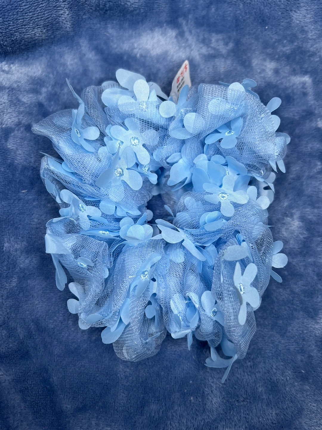 Pretty light blue scrunchie. Features small fabric flowers. Great for adding a touch of elegance to any hairstyle.