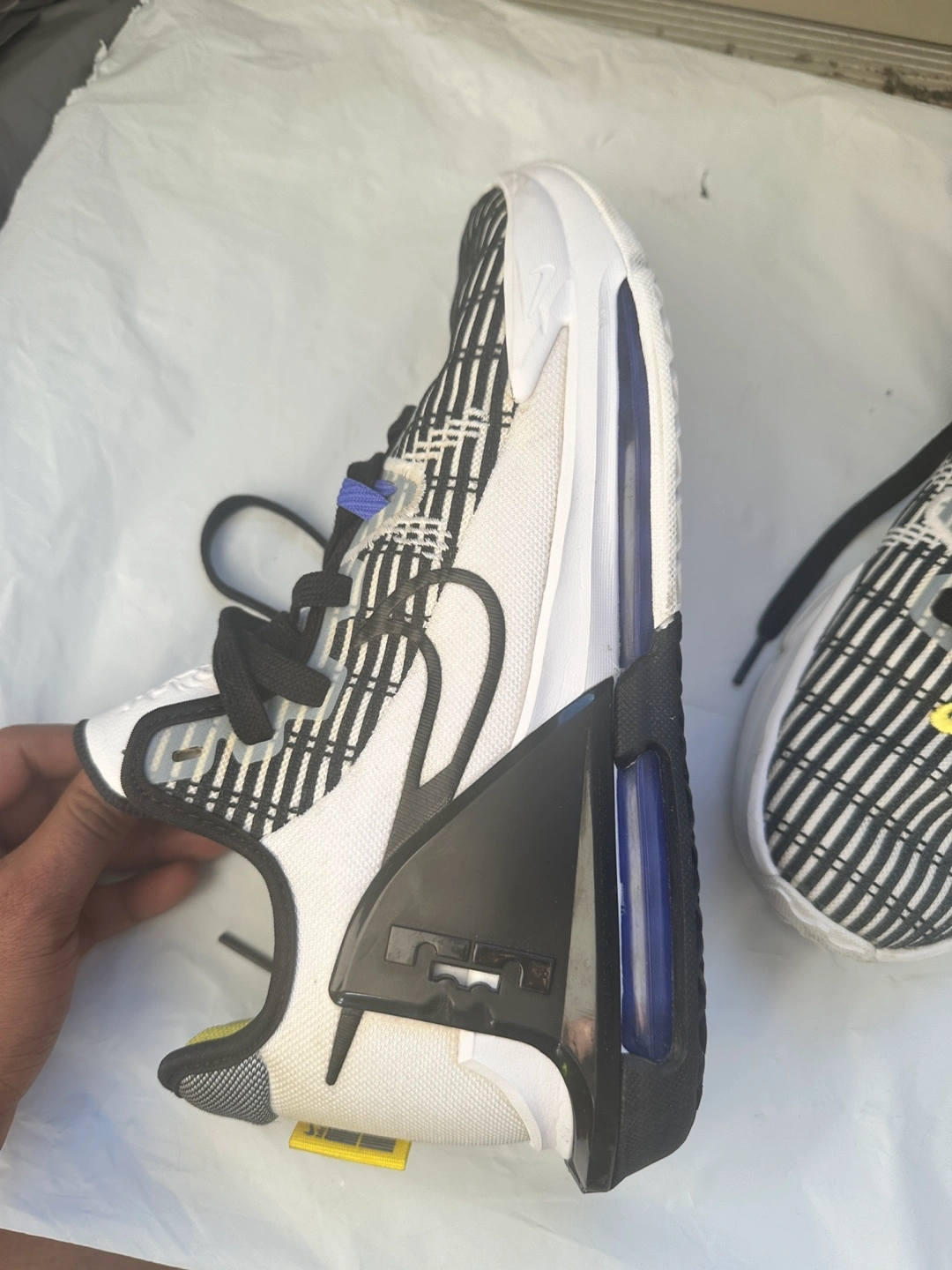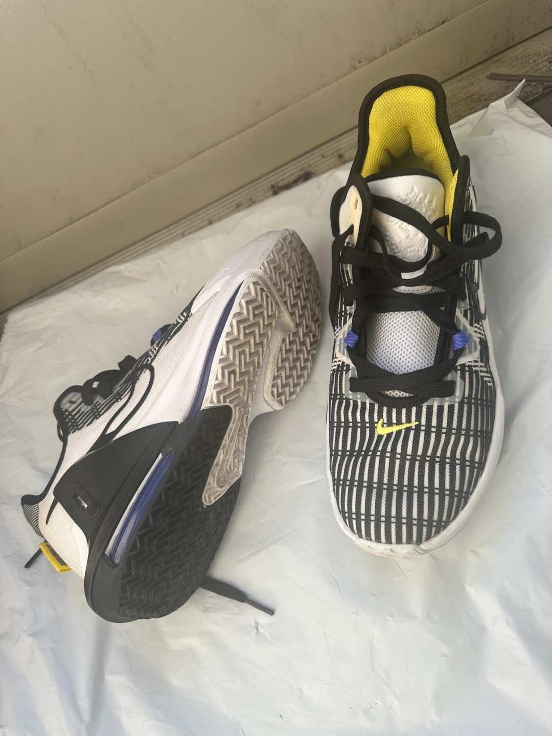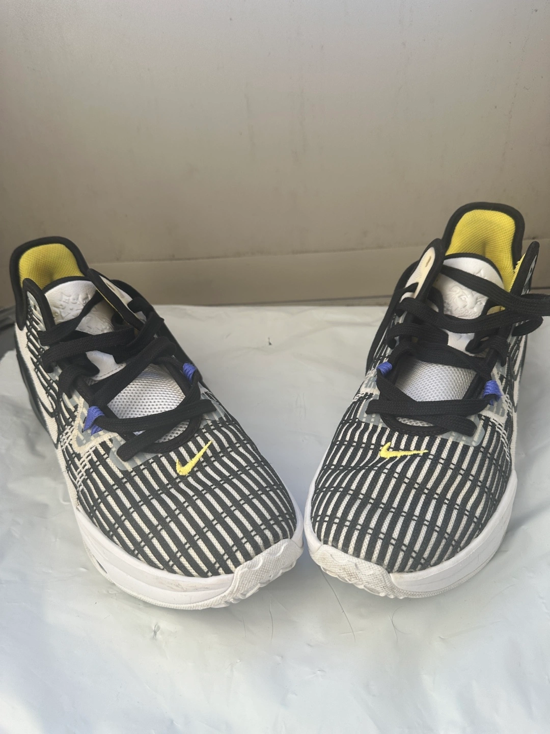 Men's Nike LeBron Witness 6 basketball shoes. Size US 10. Black and white striped design. Yellow accents.