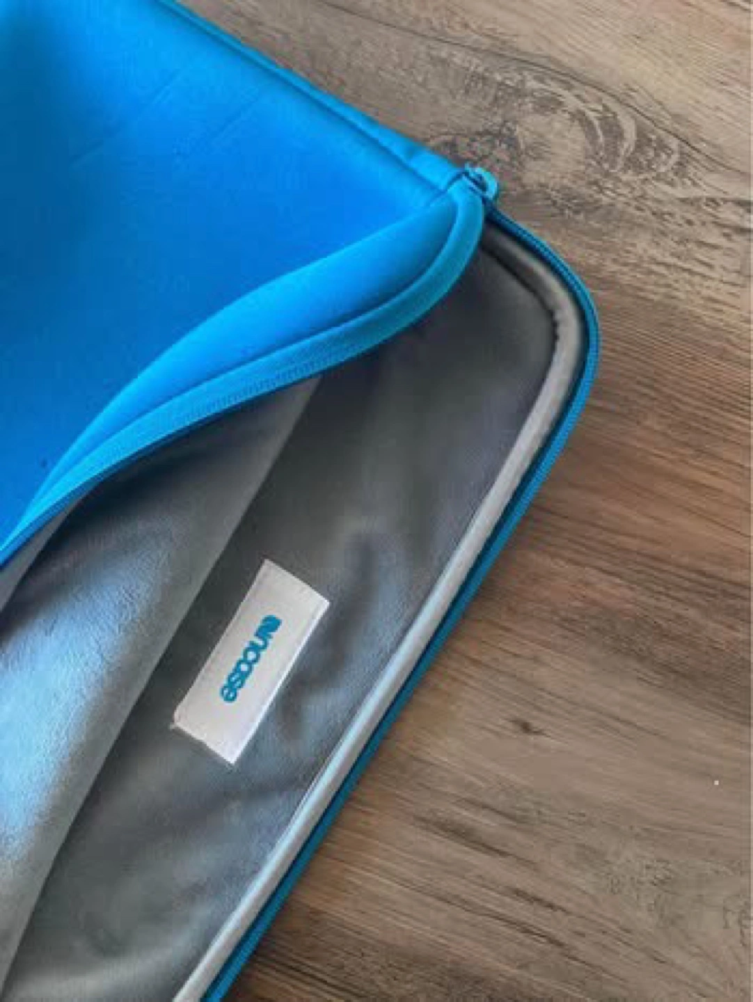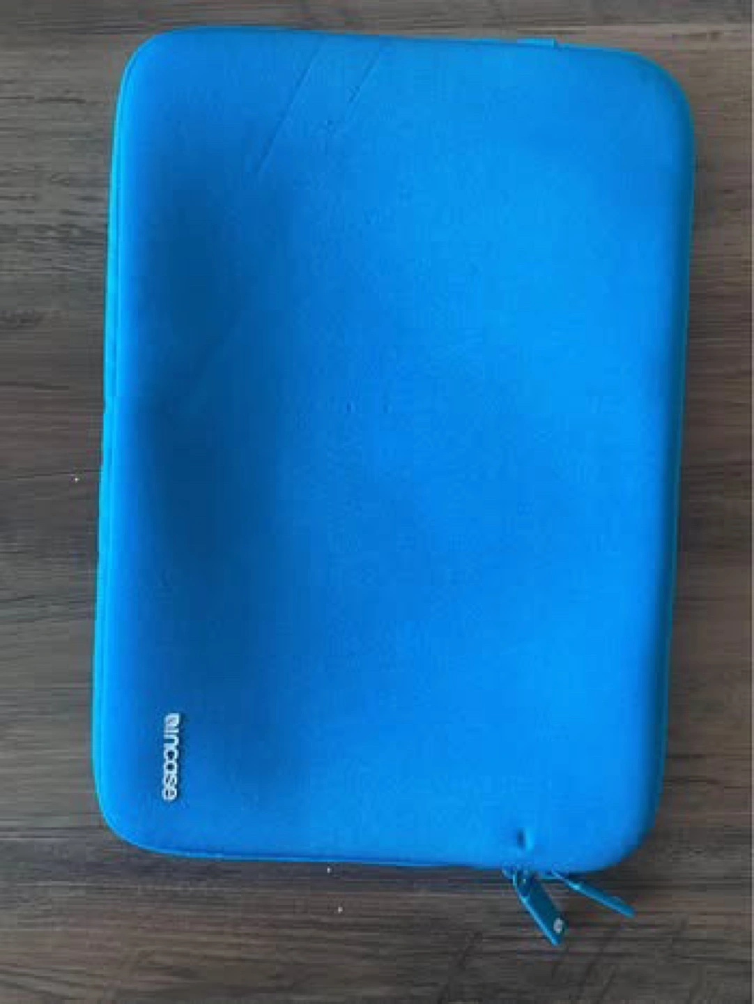 Blue neoprene laptop sleeve. Zipper closure. Soft interior lining. Protects your laptop from scratches and bumps. Great for travel.