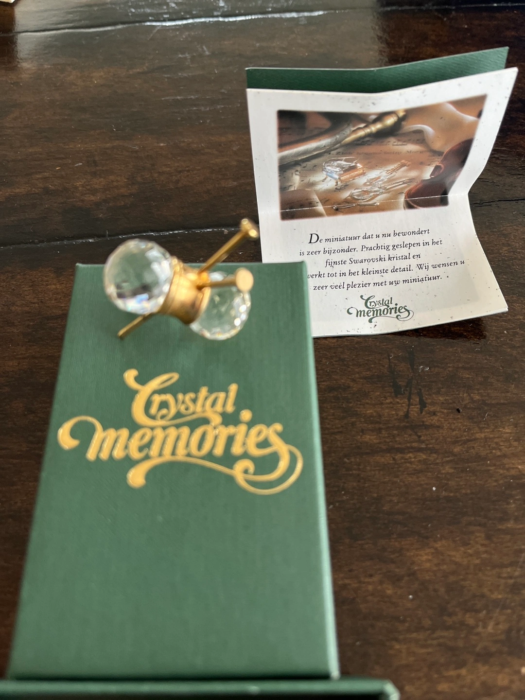 Adorable miniature sewing figurine. Features crystal balls and gold-tone accents. Presented in a green gift box with original card. Collectible item.