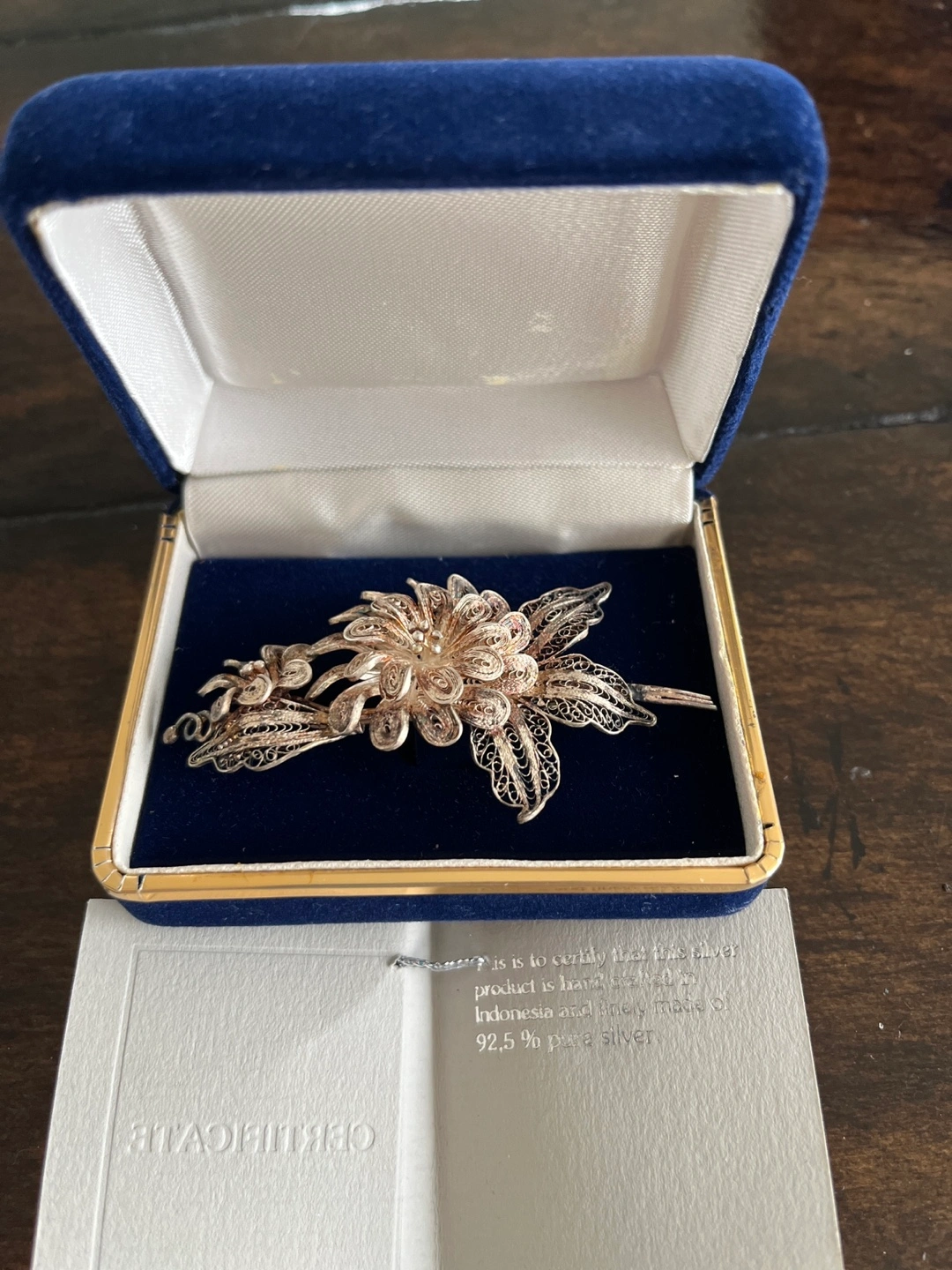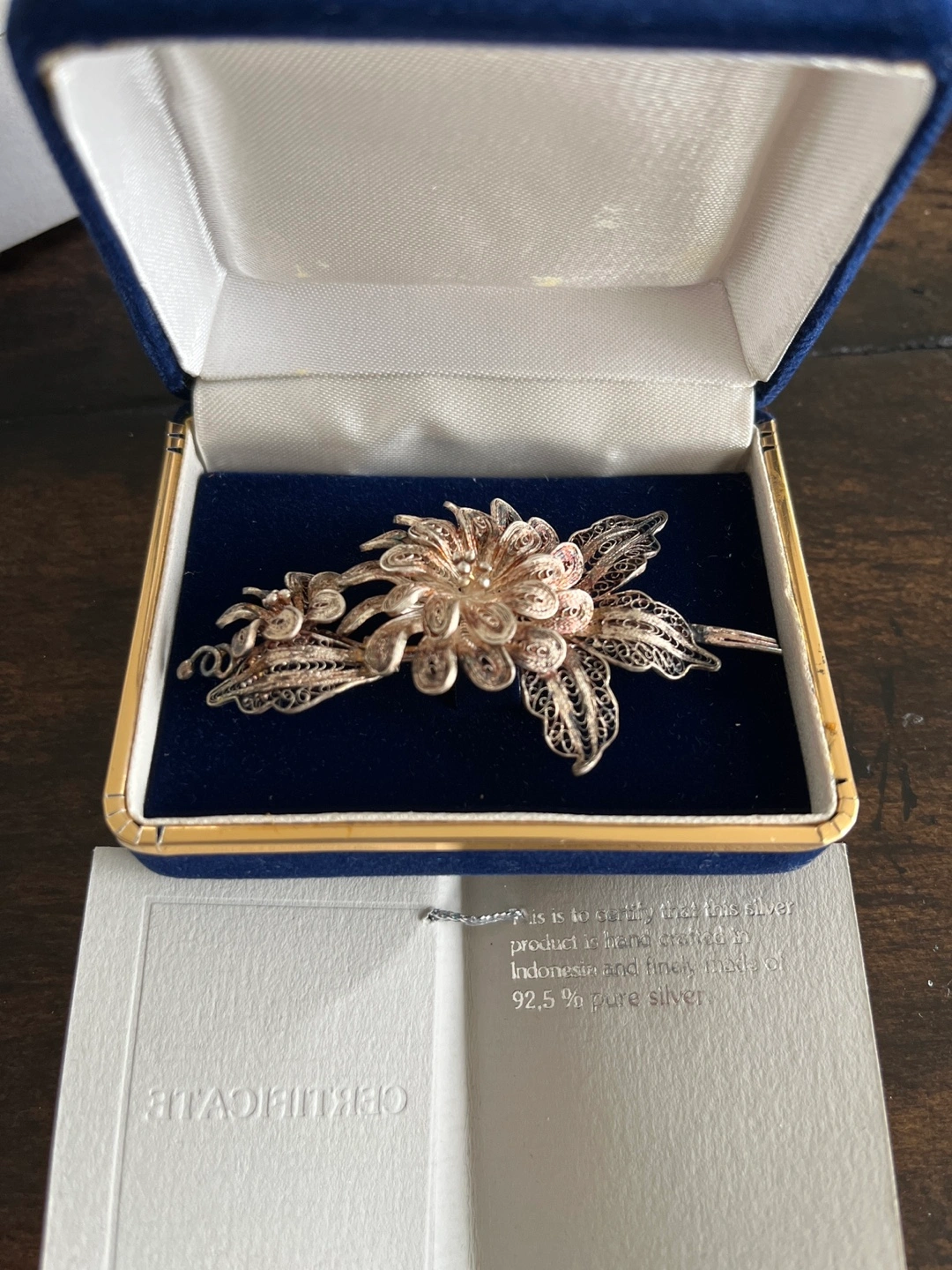 Beautiful vintage brooch. Intricate filigree design. Floral motif. Comes in original box with certificate. 92.5% pure silver. Made in Indonesia.
