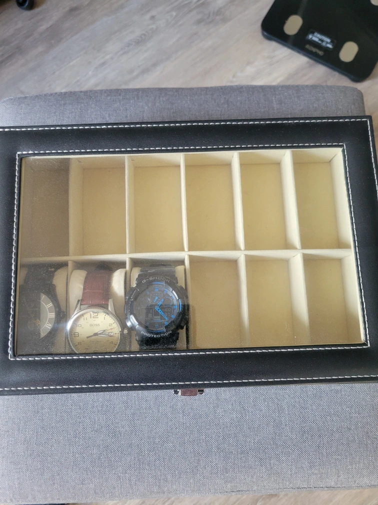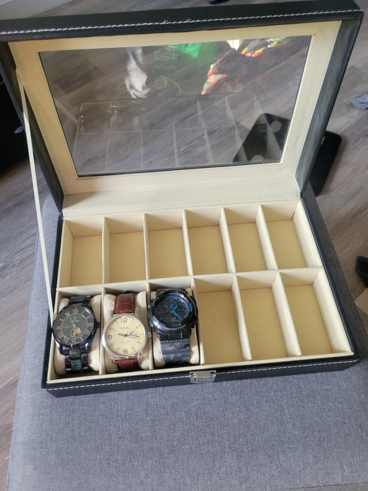 Black leatherette watch box. Ten slots for watches. Glass top for easy viewing. Keeps watches organized and protected.