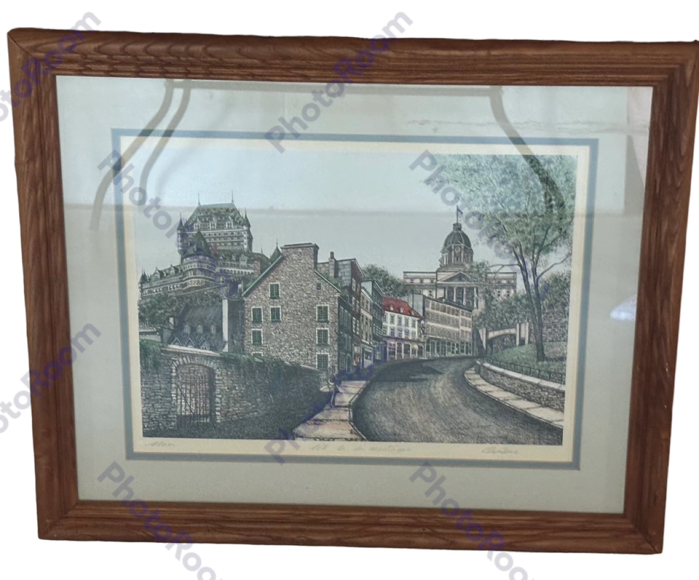 Beautiful framed print depicting a Quebec City streetscape. Features stone buildings and a curving road. Presented in a dark wood frame.