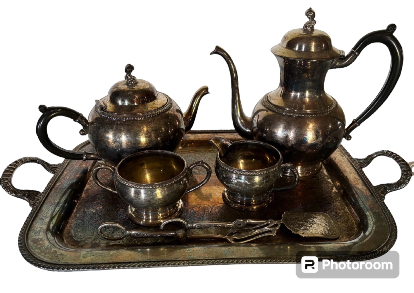 Vintage silver-plated tea set. Includes teapot, creamer, sugar bowl, and two cups. All pieces sit on an ornate silver-plated tray. Elegant design, perfect for collectors or enthusiasts.