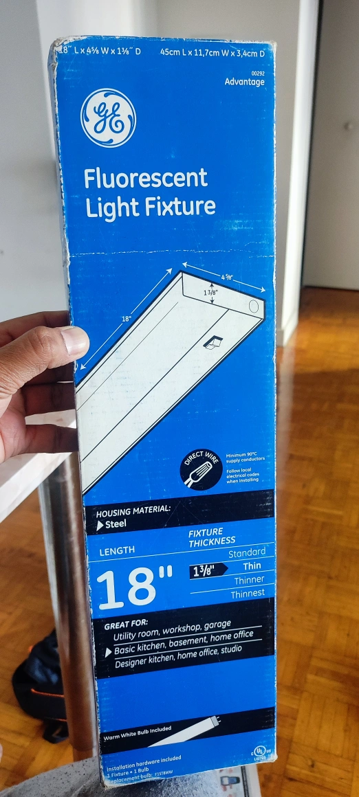 New GE fluorescent light fixture. 18" long. Includes bulbs and hardware. Ideal for utility rooms, workshops, garages, kitchens, home offices, or studios. Steel housing. Standard thickness.