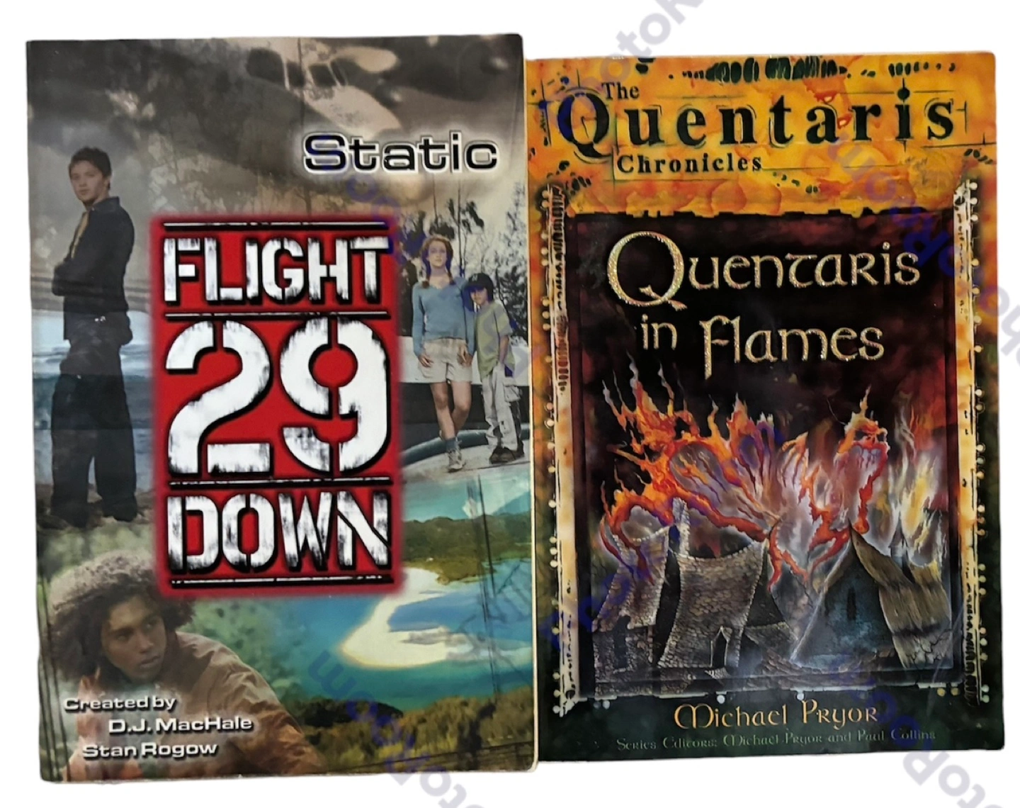 Pair of paperback young adult novels. Flight 29 Down, created by D.J. MacHale and Stan Rogow. Quentaris in Flames, by Michael Pryor. Series editors: Michael Pryor and Paul Collins.