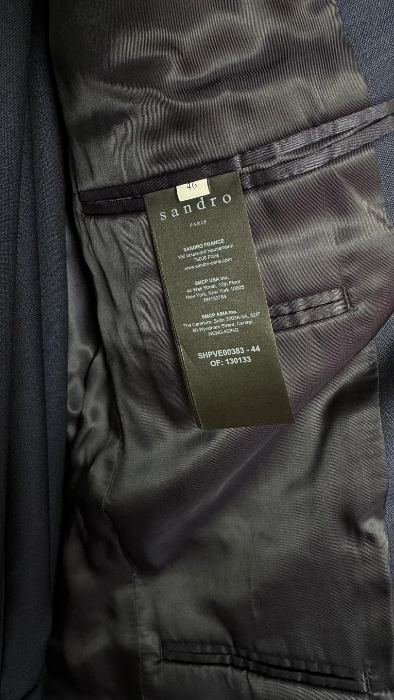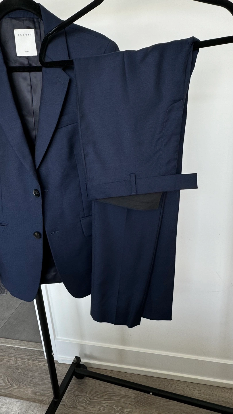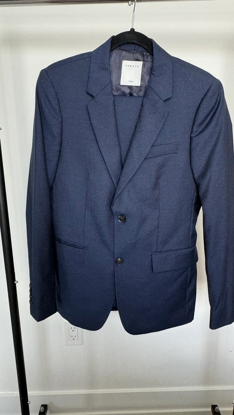 Men's navy blue suit. Sandro Navy Blue Blazer (size 46)and Trousers (size 38). The suit is in good condition, there is 1 damage and stain on the pants.Look at the all pictures please. I can sell separately