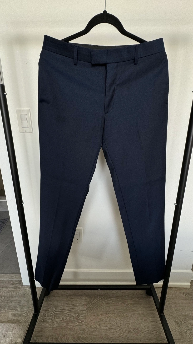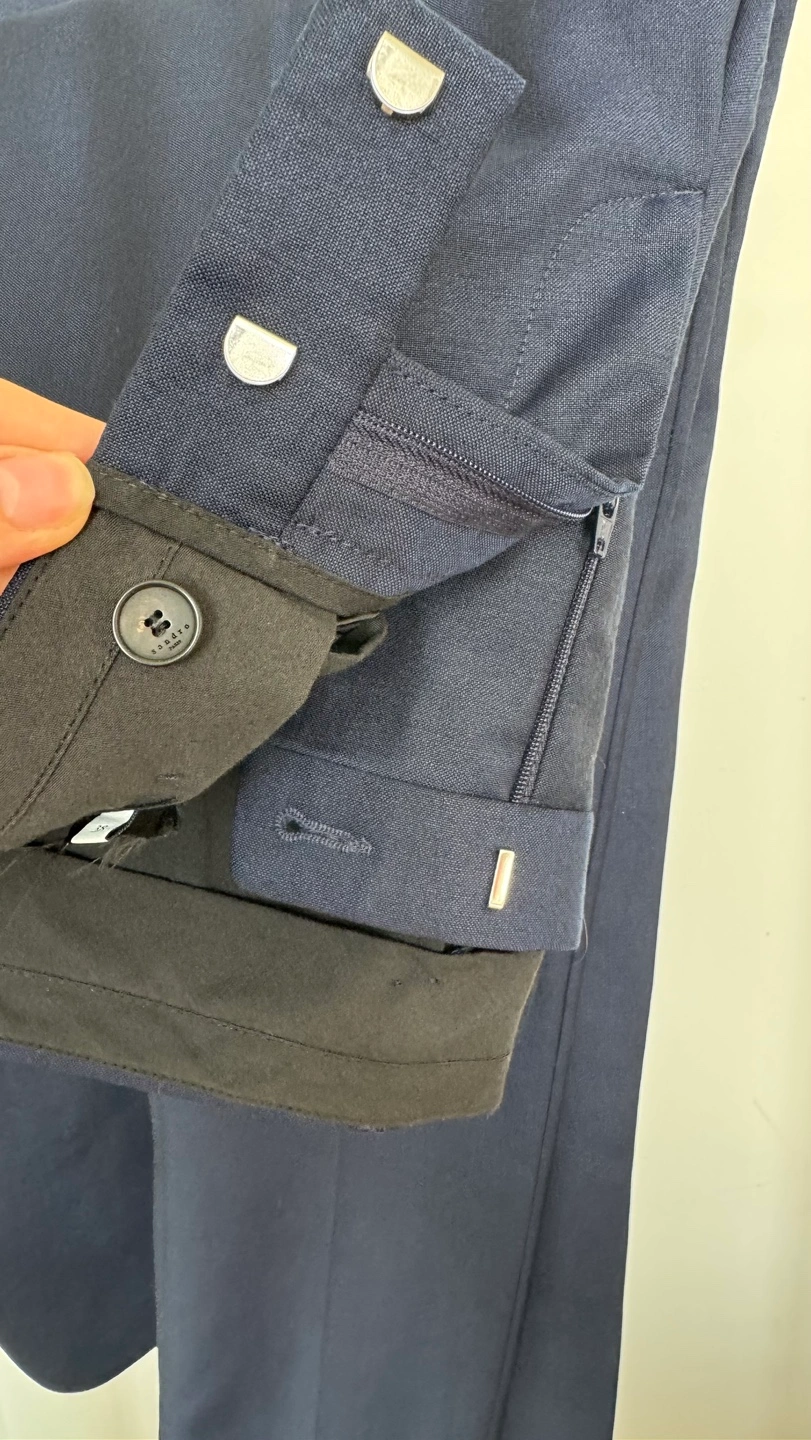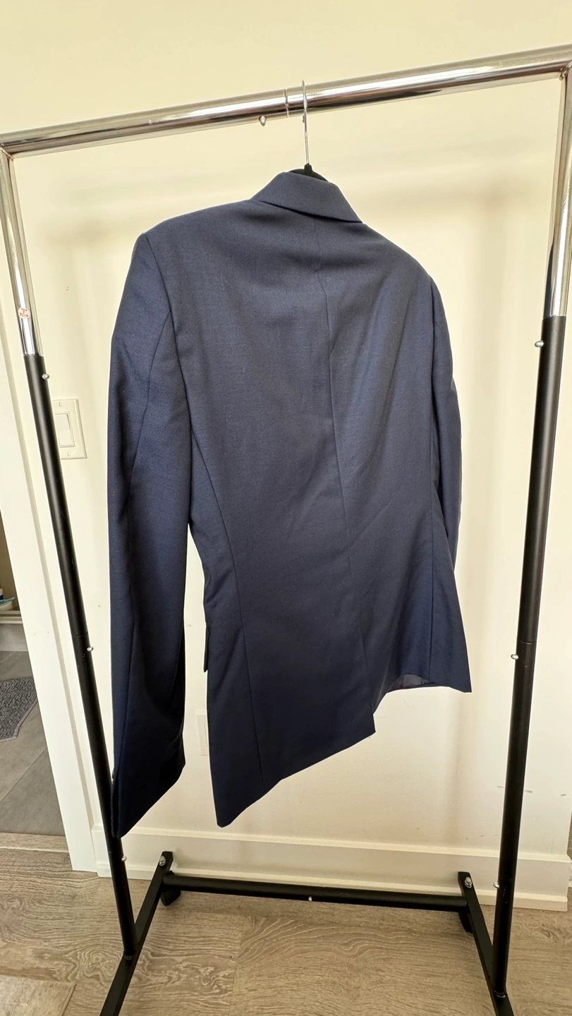 Men's navy blue suit. Sandro Navy Blue Blazer (size 46)and Trousers (size 38). The suit is in good condition, there is 1 damage and stain on the pants.Look at the all pictures please. I can sell separately