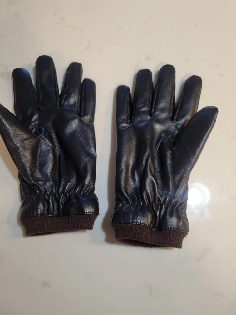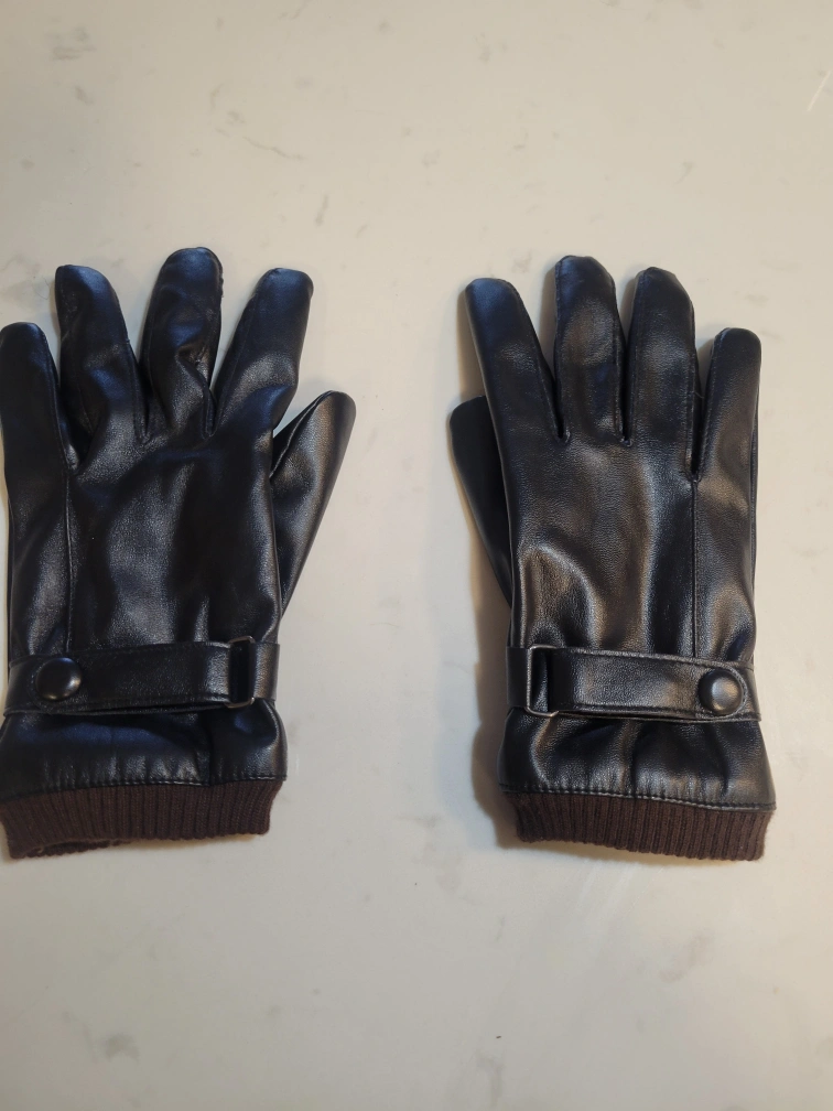 Pair of men's black leather gloves. Brown ribbed cuffs. Snap closure. Good for cold weather. Brand new, opened and used it once and doesn't fit the size.