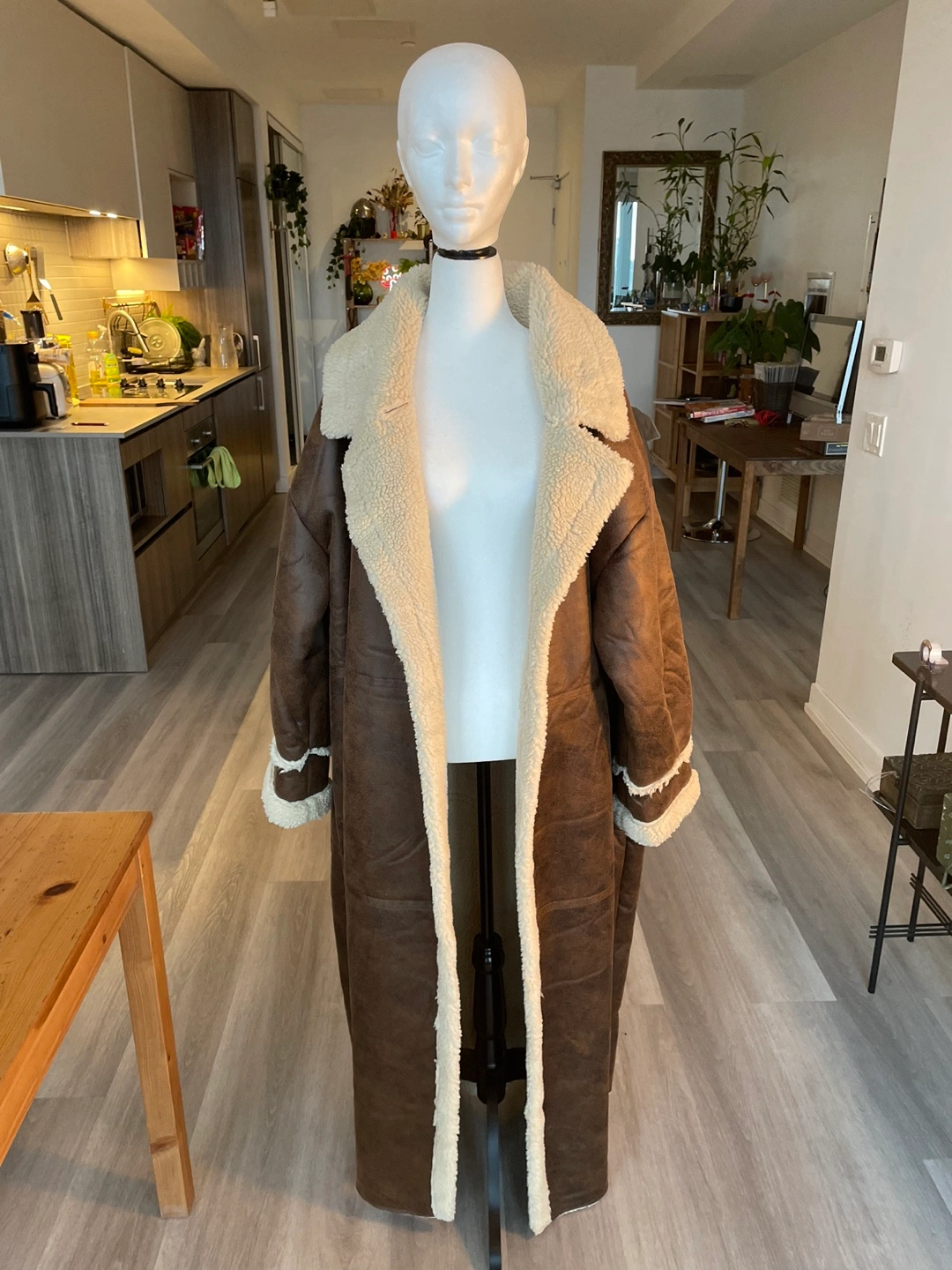 Longline brown faux shearling coat. Features a cream sherpa lining and oversized fit. Excellent winter outerwear.