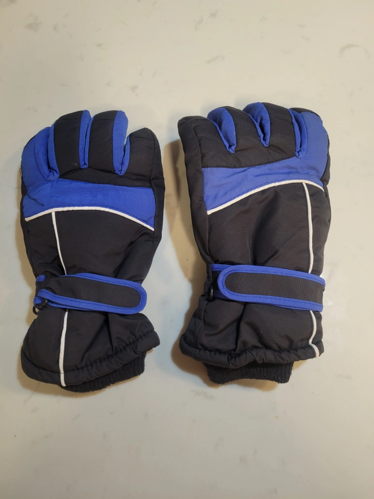 Pair of winter gloves. Black with blue accents. Insulated. Adjustable wrist straps. Good for snow play.