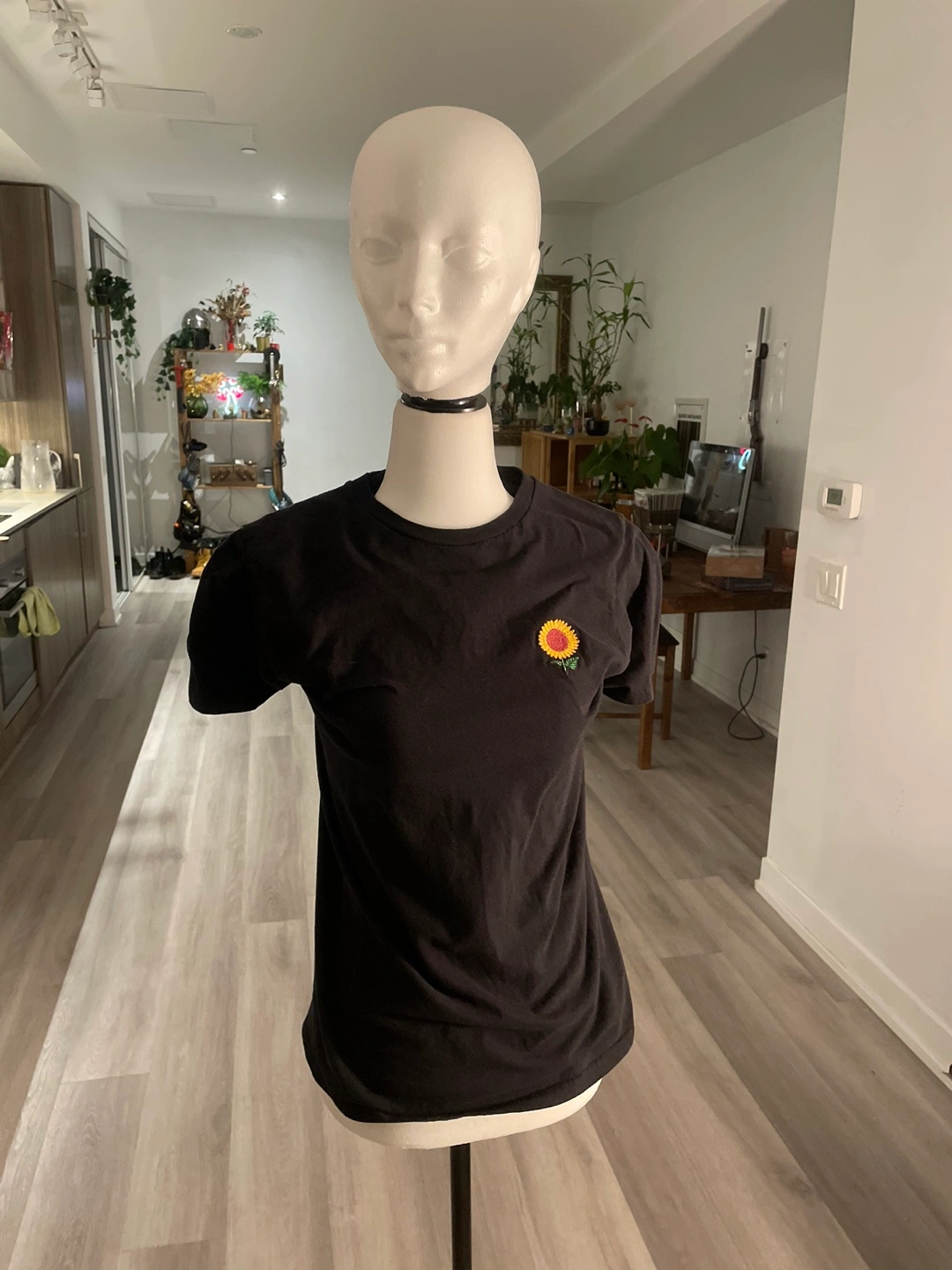 Women's black short sleeve t-shirt. Features a small embroidered sunflower on the front. Simple, casual style. Great for everyday wear.