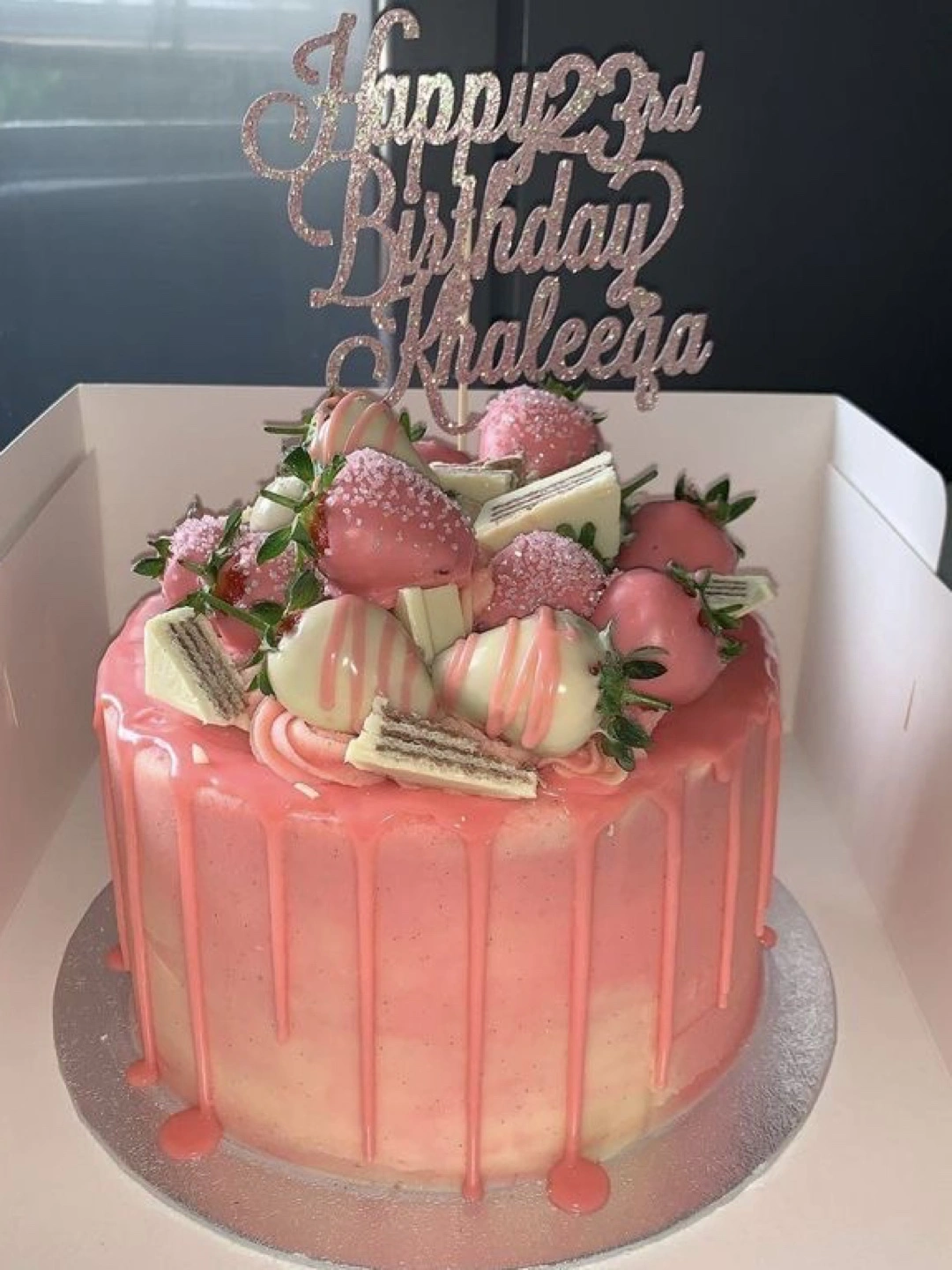 Strawberry cake layers with frosting, pink chocolate drips, white chocolate wafers and chocolate dipped strawberries. Topper is extra cost. MADE FRESH.