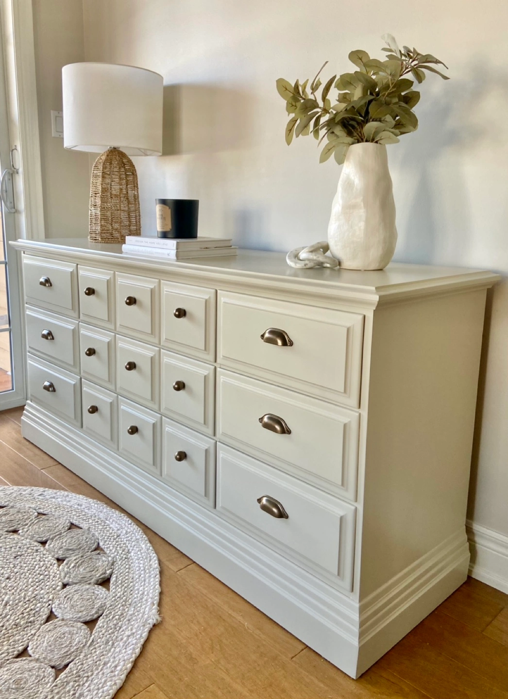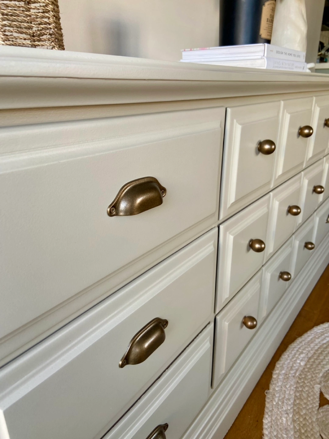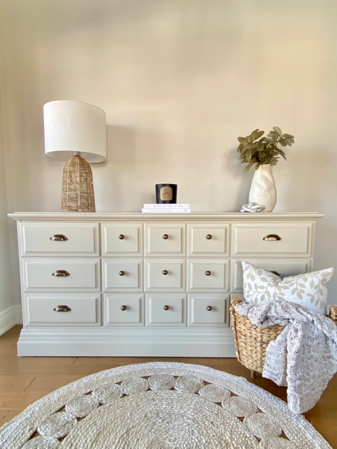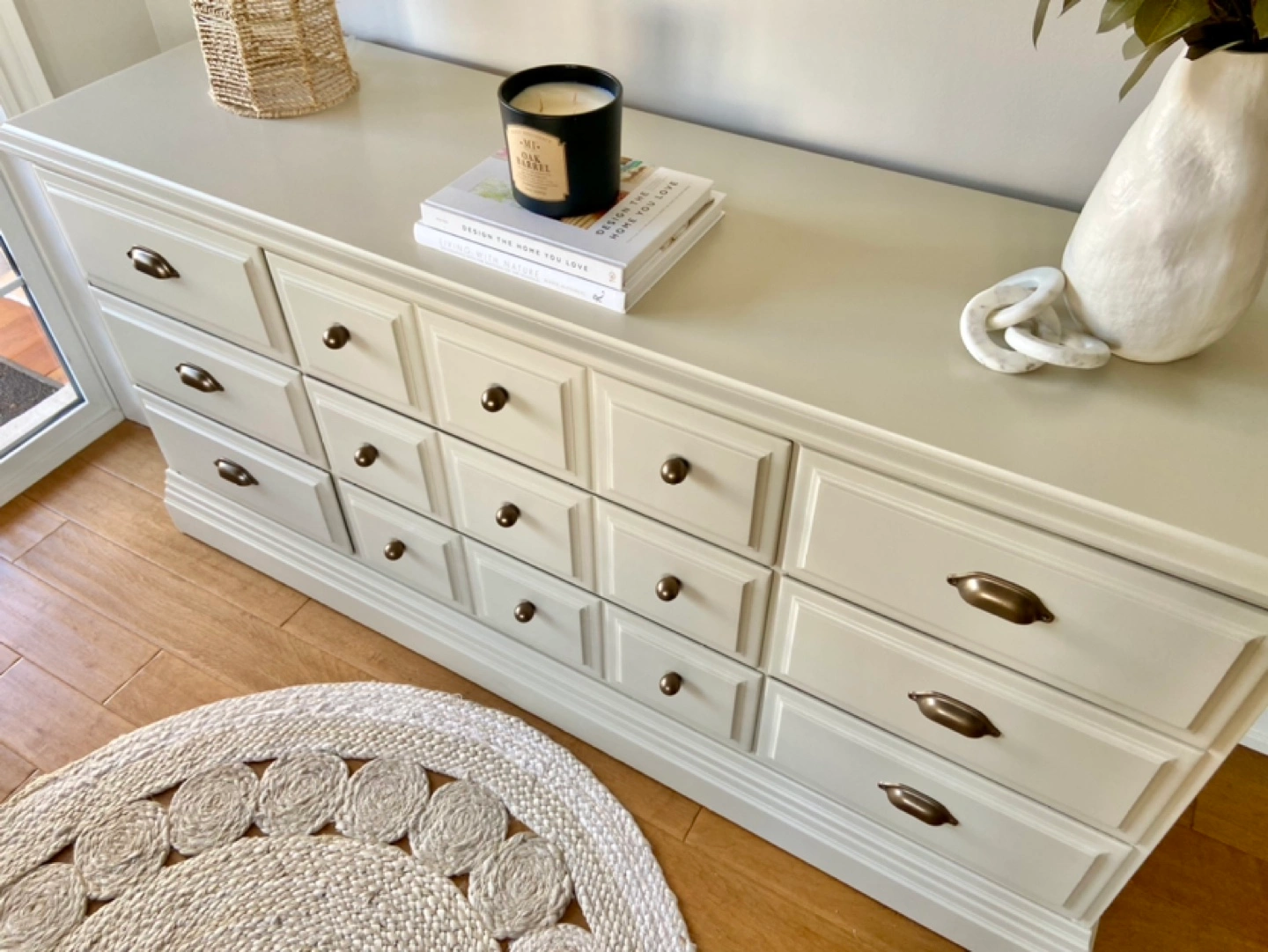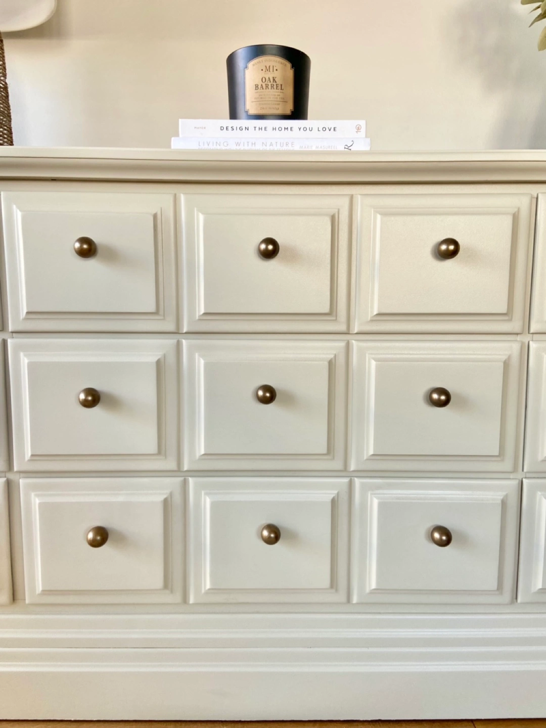 Newly refinished 9-drawer dresser, made of solid maple. Painted in a beautiful, neutral, sand shade, and sealed for long-term durability. Combination of brand-new brass coloured knobs & handles installed on the drawer fronts. The middle row of drawers is extra wide (with 3 panels on each drawer).