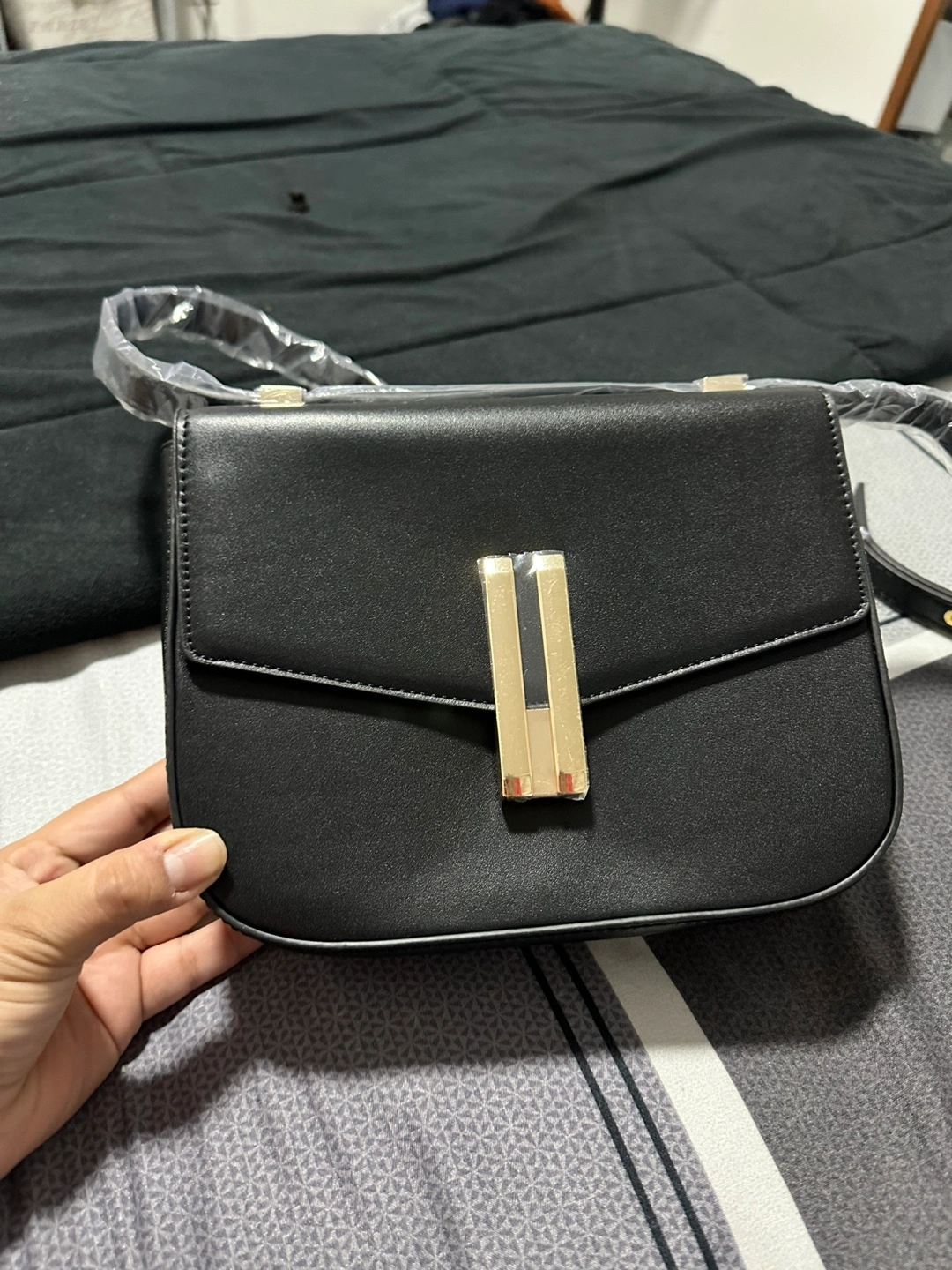 Stylish black crossbody bag. Features a gold-toned clasp and adjustable strap. Perfect for everyday use. Lightweight and easy to carry.