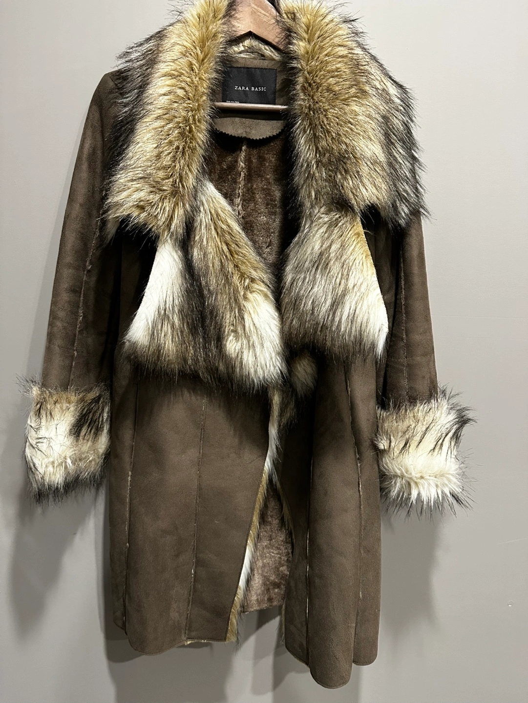 Longline suede coat. Features a large faux fur collar and cuffs. Open front. Olive green.